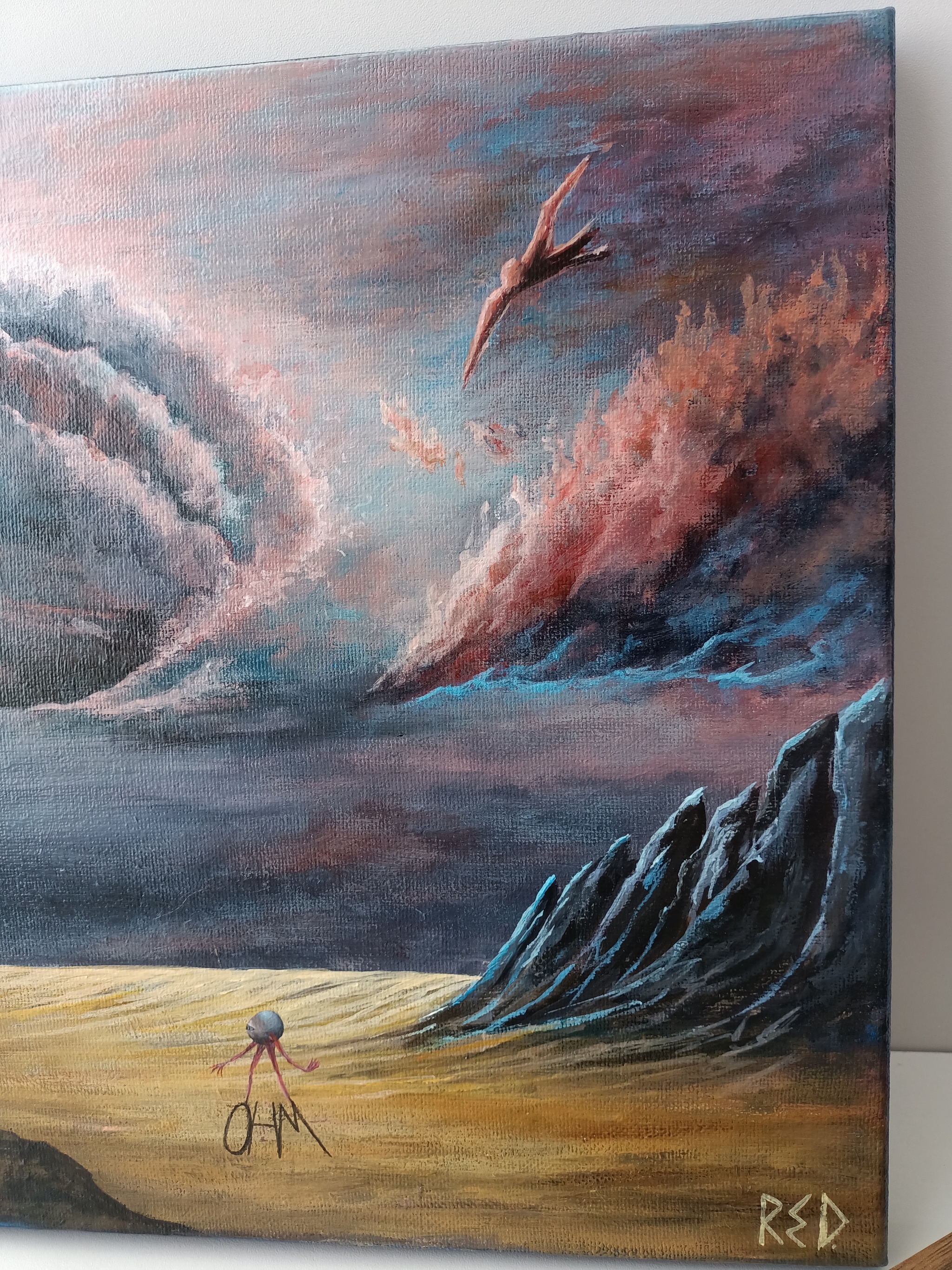 Грозовые облака, изогнутые в пугающую спираль, и странная летающая фигура вдалеке создают атмосферу тревоги и неизведанности. Скалы на горизонте словно обрамляют сцену, оставляя ощущение замкнутости этого странного мира.