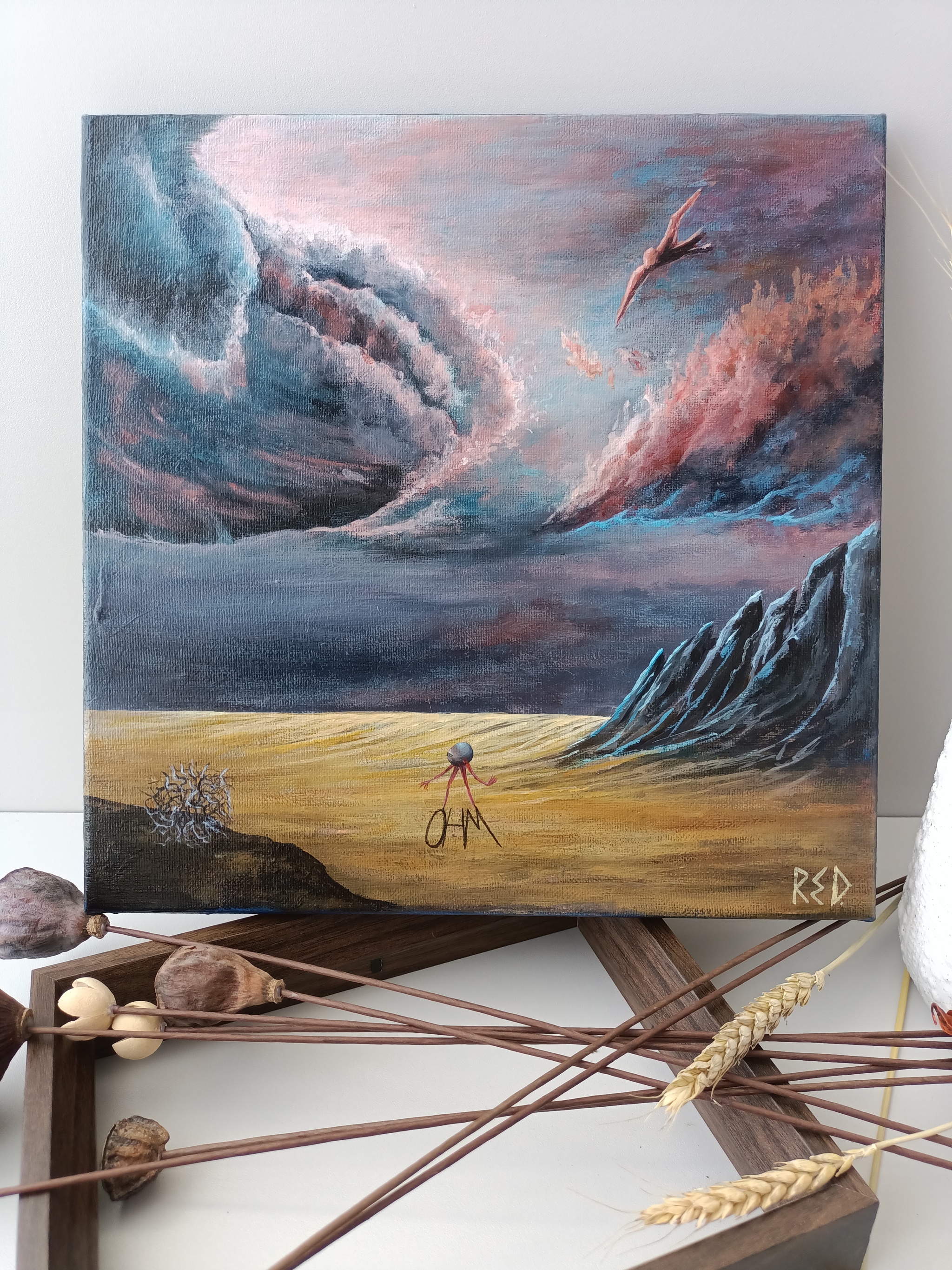 Картина в стиле фантастики, постапокалипсиса, выживания. Фэнтезийный пейзаж с существами. Картина из серии "ПроЭпиЛог". Картина авторская, концептуальная, сюжетная и в единственном экземпляре. На этой картине запечатлён мир, переживший катастрофу, где законы привычной реальности больше не действуют. Главный герой — перекати-поле, символизирующее беспомощность и вечный поиск. Оно перекатывается по пустынной равнине, отражая стремление найти свой путь в хаосе.