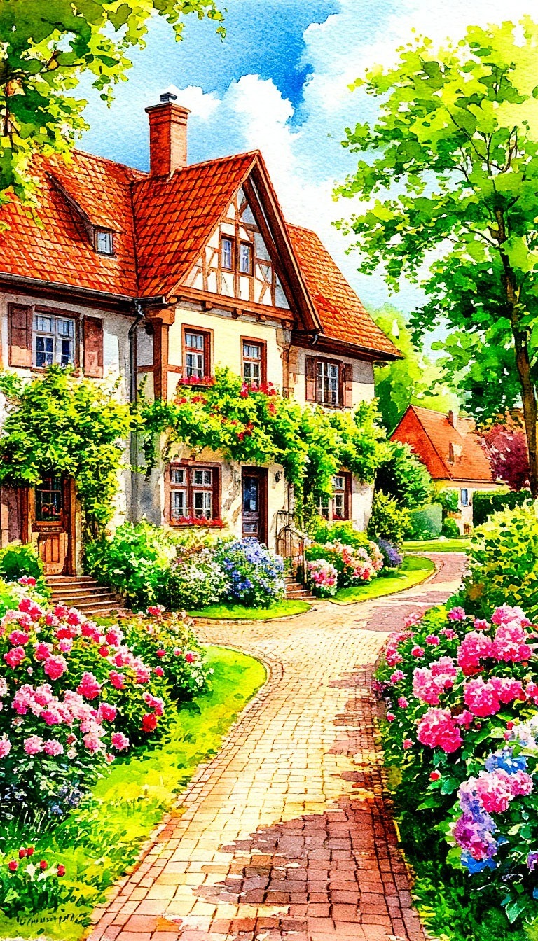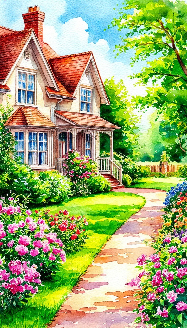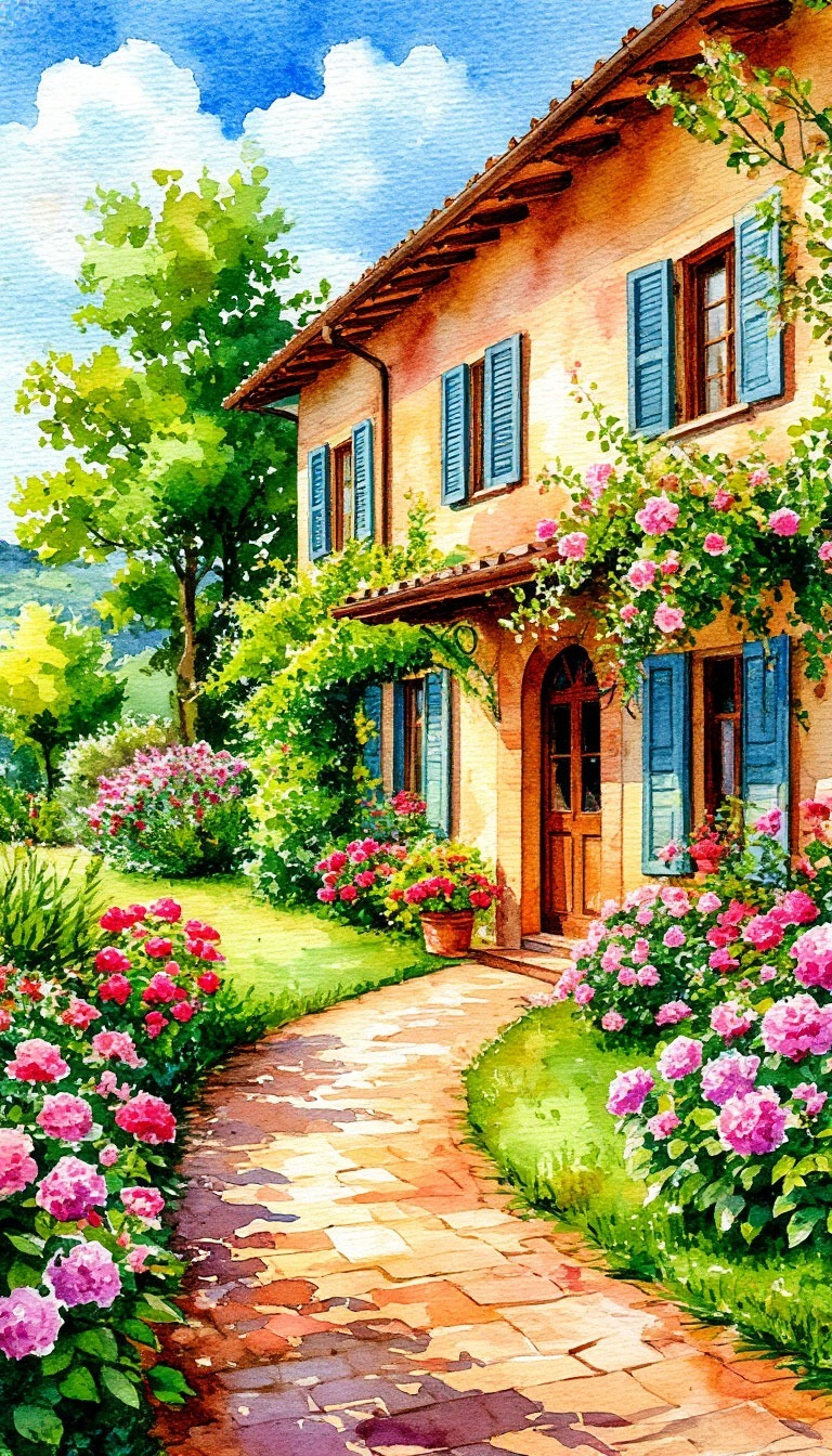 Предлагаю Вашему вниманию авторские обои и заставки на телефон в виде акварельных картин с красивыми домами и цветущими садами.