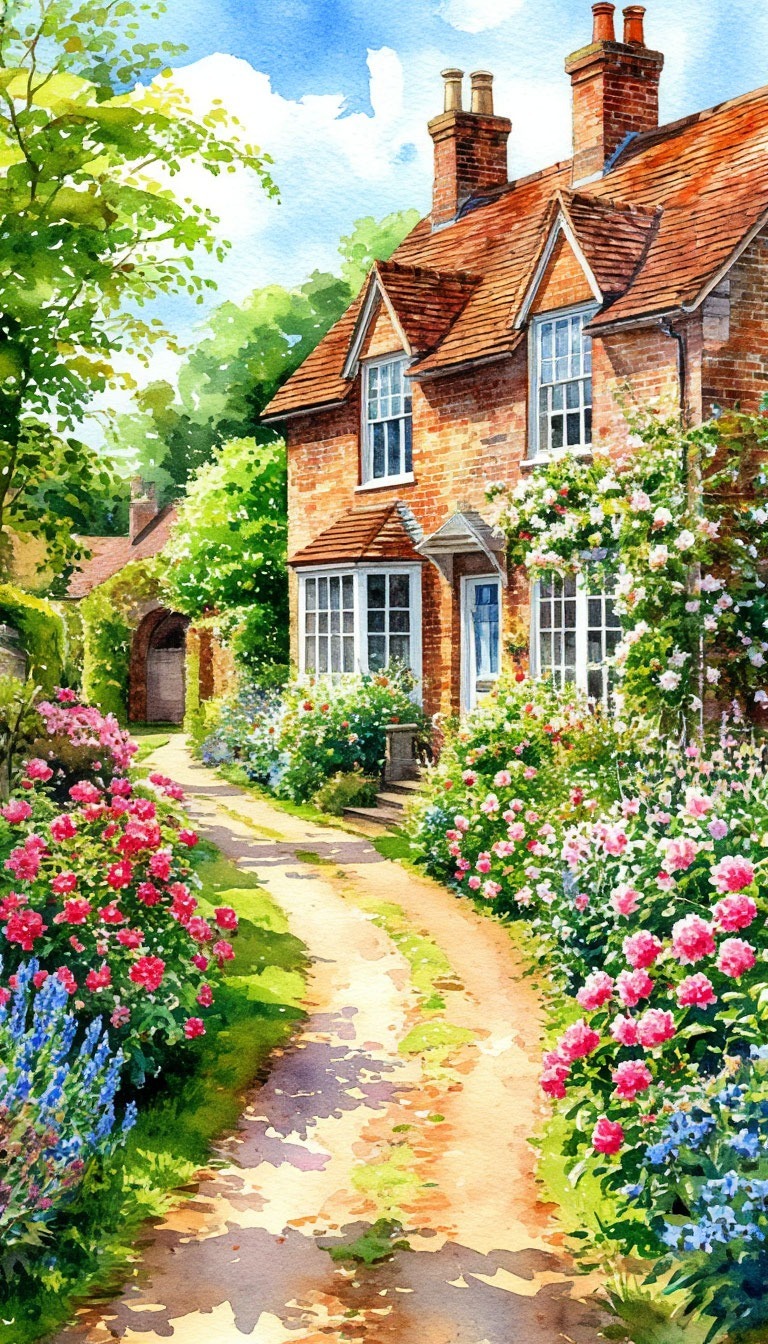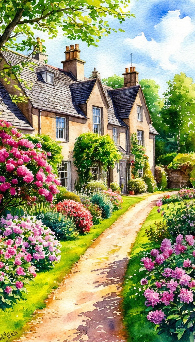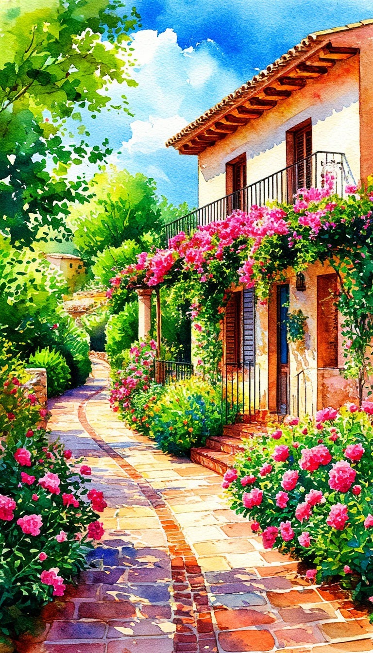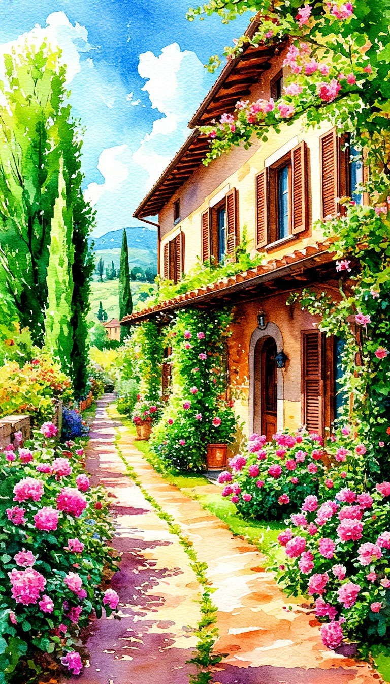Предлагаю Вашему вниманию авторские обои и заставки на телефон в виде акварельных картин с красивыми домами и цветущими садами.