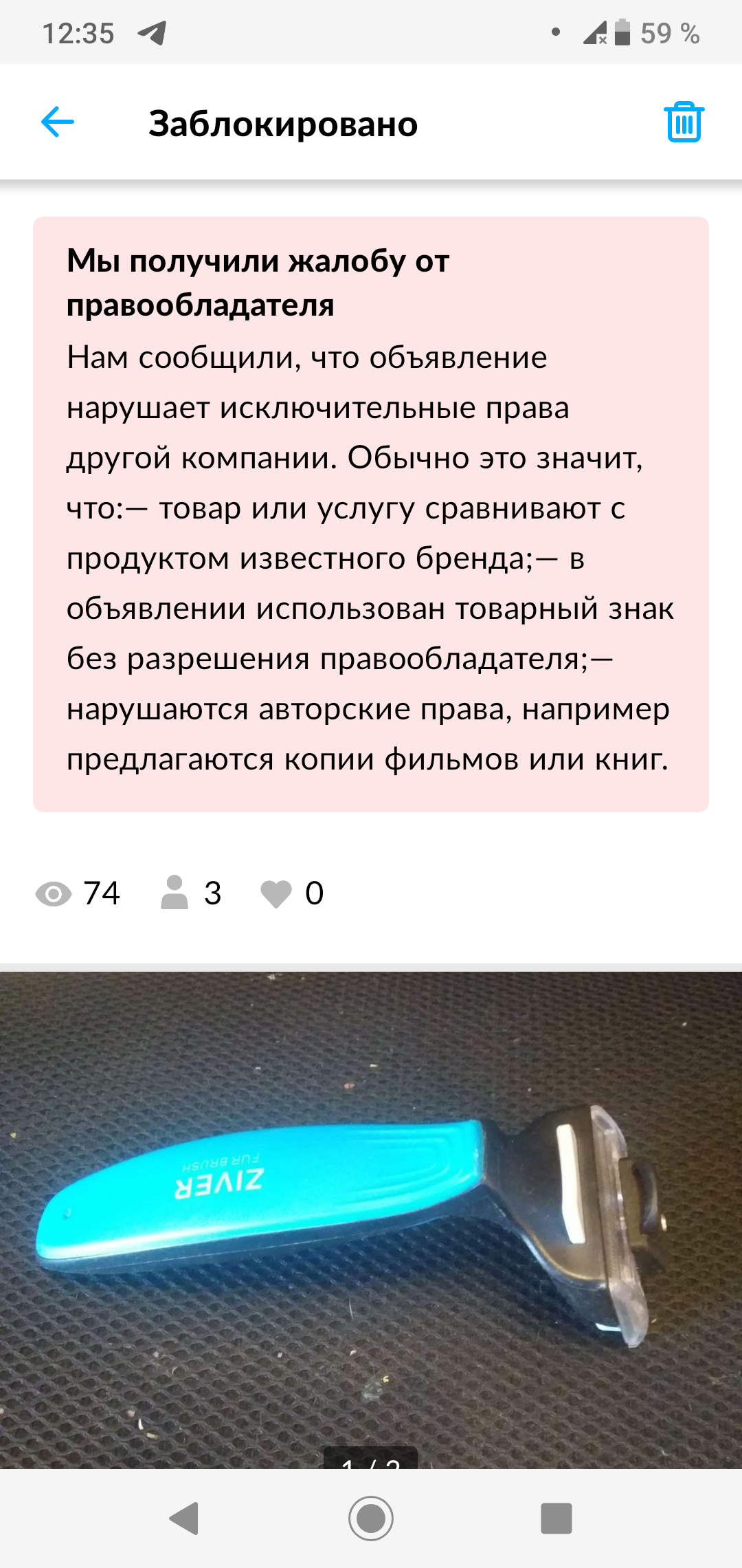 Товар уже продан и объявление закрыто, но так и не могу понять : чьи авторские права нарушил мой фурминатор?