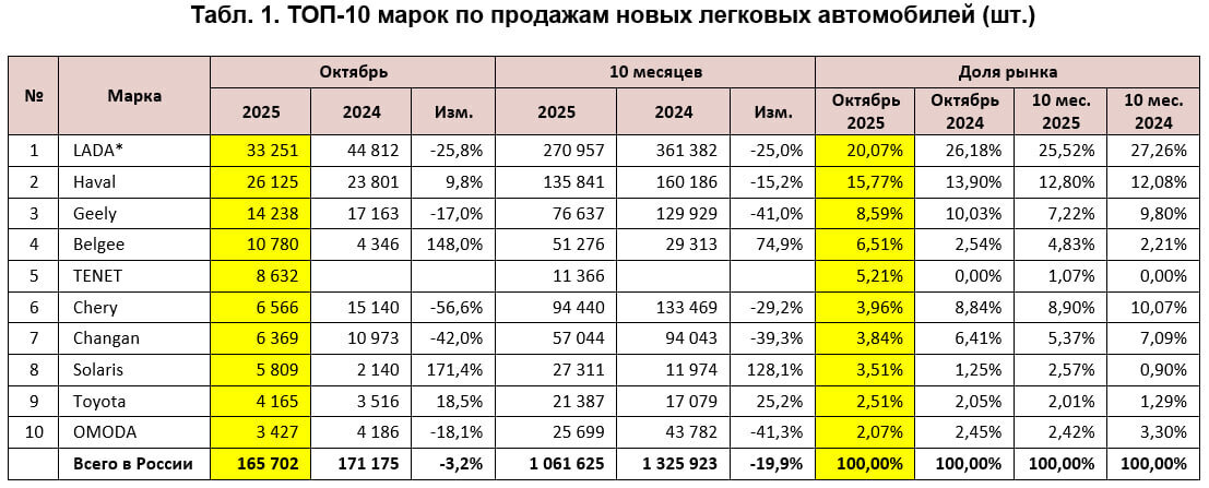 По данным агенства «Автостат» в октябре в России продали 165 702 новых легковых автомобиля, динамика относительно октября 2024-го — минус 3,2%.
