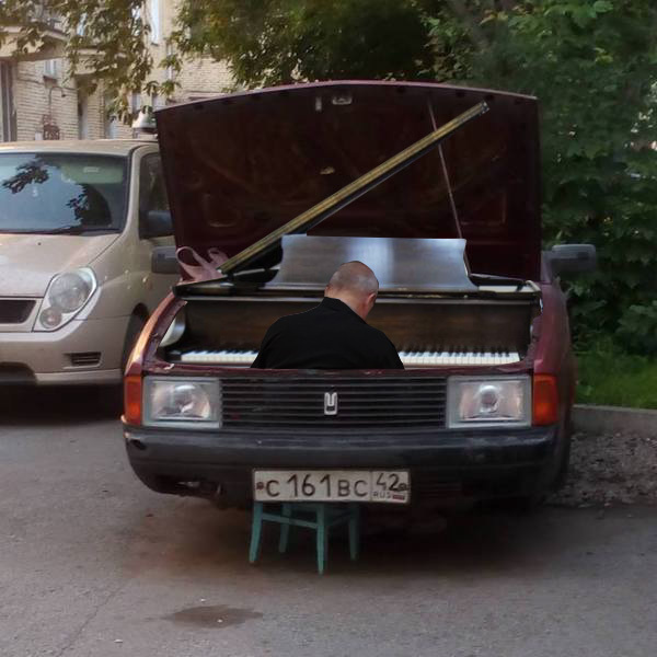 А что в Москвиче можно таким образом чинить? Раз мотора там нет, скорее всего коробки тоже. Мужик просто там тусит?