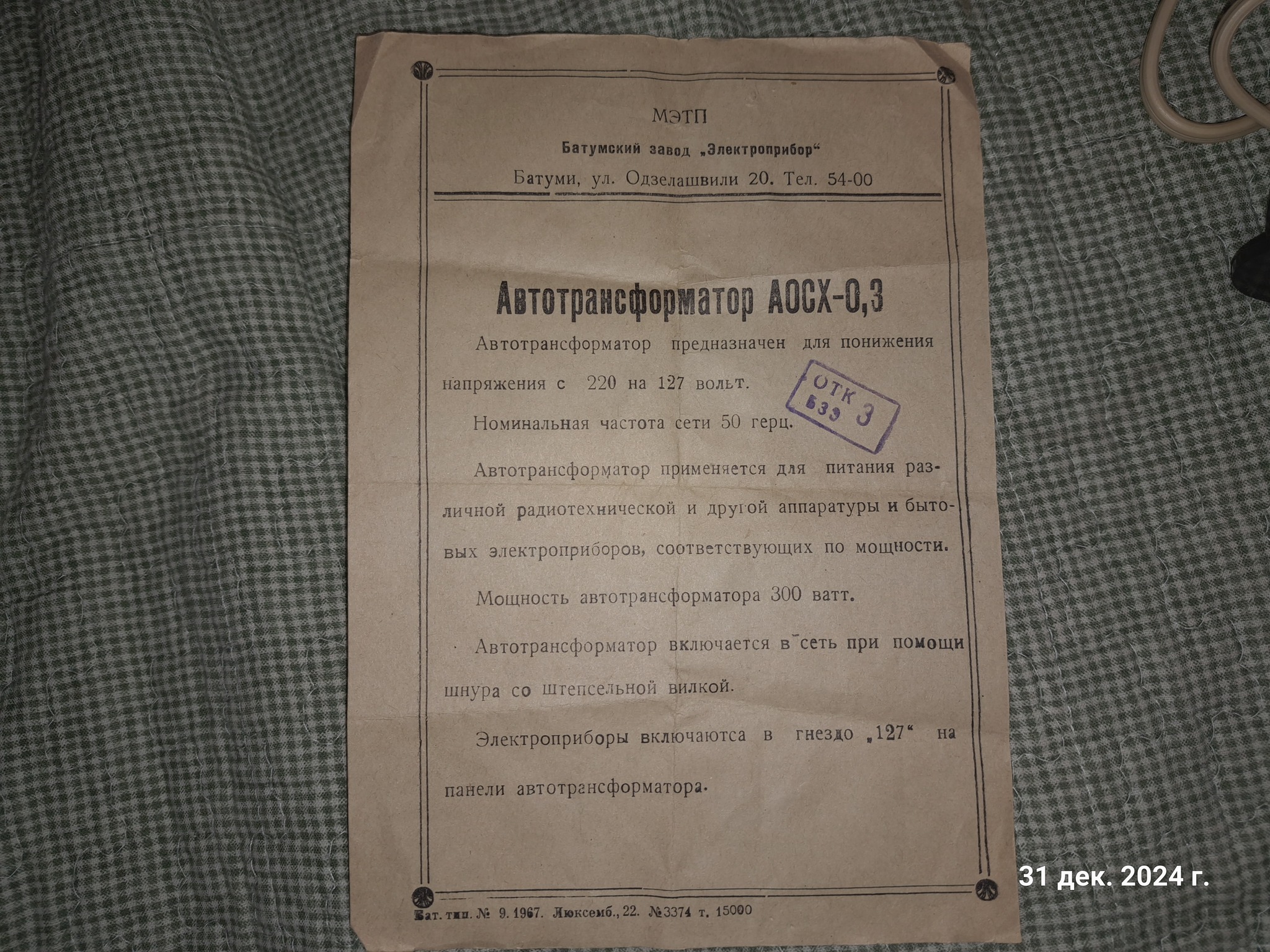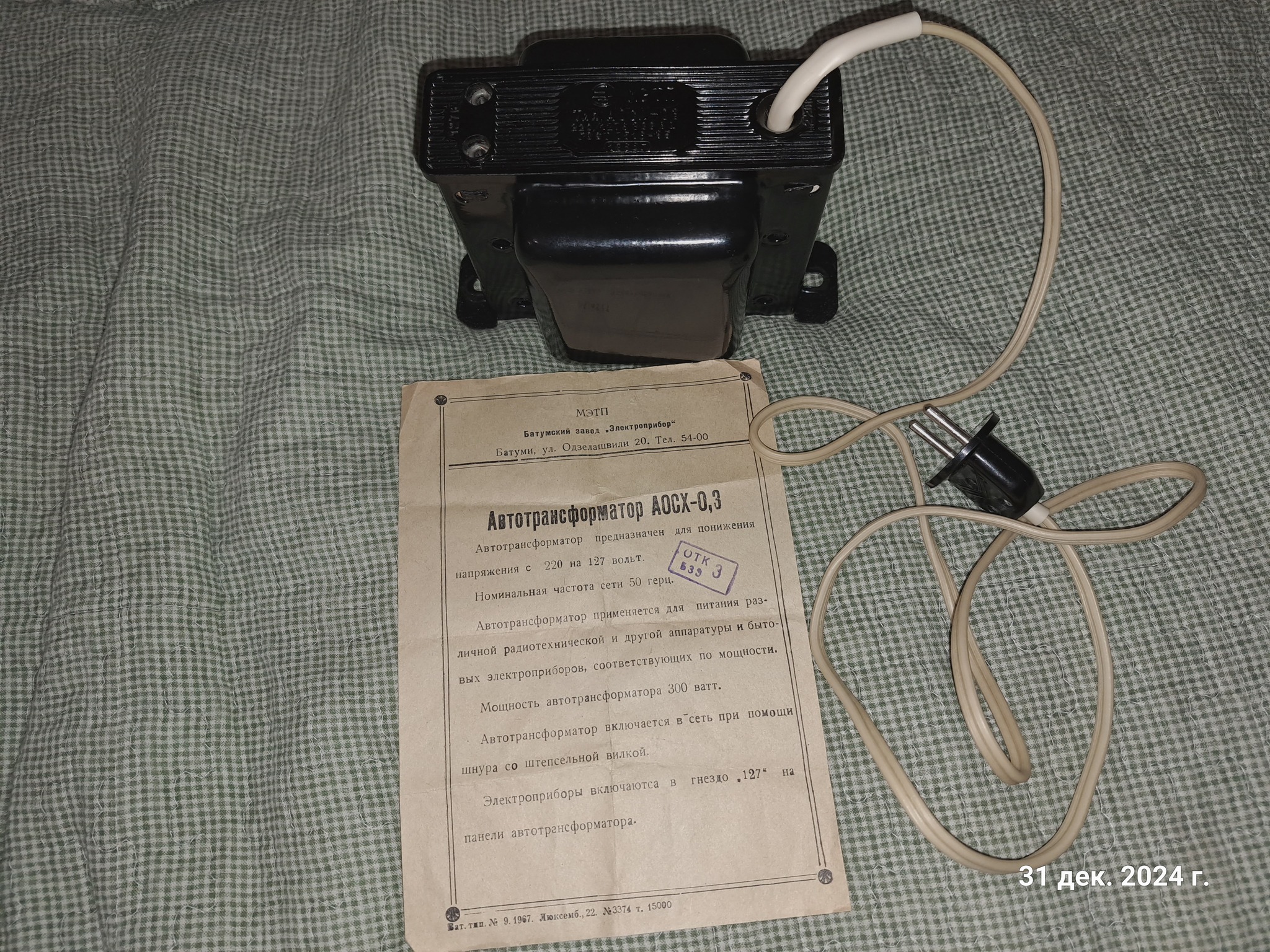 Не так давно удалось найти старинный преобразователь напряжения типа АОСХ-0.3 выпуска 1966 года в новом состоянии с техпаспортом. Автотрансформатор предназначен для понижения напряжения сети с 220 на 127 вольт для питания старых холодильников и других устройств на 127 вольт от сети 220. Производитель - Батумский завод Электроприбор (единственный известный мне преобразователь напряжения этого завода, в основном там выпускались ЛАТРы). В основном АОСХ выпускались в Москве (Московский трансформаторный завод и электромеханический завод) и Запорожье (Запорожский трансформаторный завод), также было производство в Армянский ССР и в Ярославле ("Красный маяк"). Выпускал их также неизвестный завод с обозначением "СУМП СМЗ".