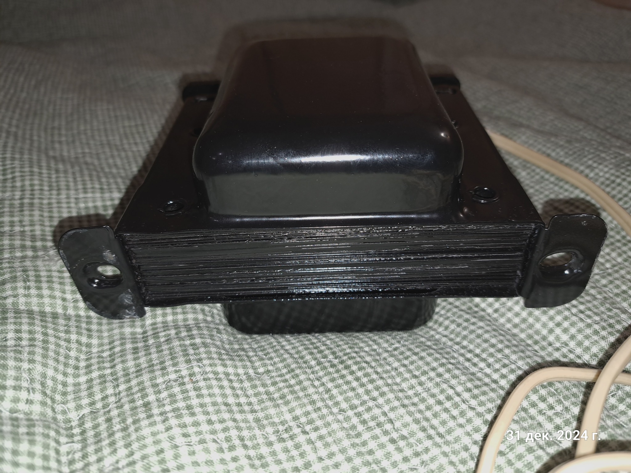 Автотрансформатор выполнен в неразборном металлическом корпусе на заклёпках, провода припаяны к выводам под бакелитовой крышкой с гнездом для вилок и отверстием для шнура.