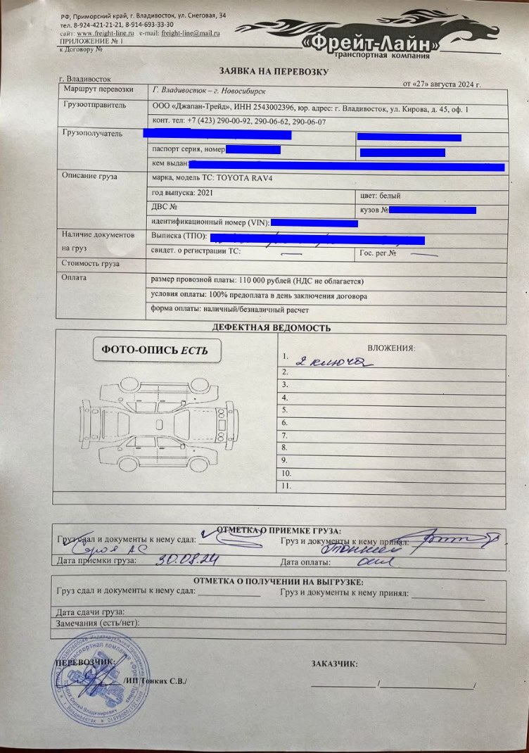 ТК Фрейт Лайн из Владивостока крайне не рекомендую, нагло врут по срокам отправки автовоза с автомобилем при заключении договора. Поставили автомобиль в очередь на отправку из Владивостока в Новосибирск еще 27 августа, обещали что отправка будет в течении 15 дней + в дороге 8-10 дней. В итоге везли дольше 2х месяцев. То автовоз сломался и из-за этого сместилась очередь (месяц кормили «завтраками», то в конце недели, то через два дня отправим). 11 октября наконец сообщили что авто отправлен, но когда он должен бы уже вот-вот приехать в Новосибирск, оказалось что он едва проехал пол пути и находится в Иркутске (и то узнал эту информацию только от директора, т. к. менеджер вообще обещал что приедет к 19-20 октября). В итоге автомобиль получил, целый без повреждений, но только 28 октября. Многие подумают - ну целый же, чего тебе еще надо? Представьте, что вы купили новый авто о котором долго мечтали и вот он уже растаможен, находится в России, стоит на стоянке и дело осталось только за его доставкой до вашего города. В вам каждую неделю рассказывают сказки о том что "вот прям уже вот-вот точно отправим, вот в эту дату точно уже поедет" - конечно это нервирует. В моменте даже думал что вообще свой авто не увижу.