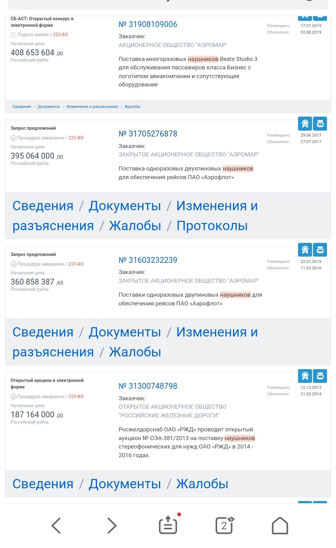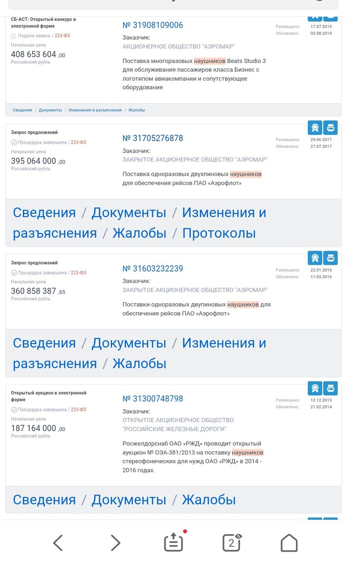 Но это еще не всё. В 2016 и 2017 годах аэромар уже проводил закупки наушников с нмц 360 000 000 и 390 000 000 рублей.