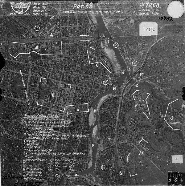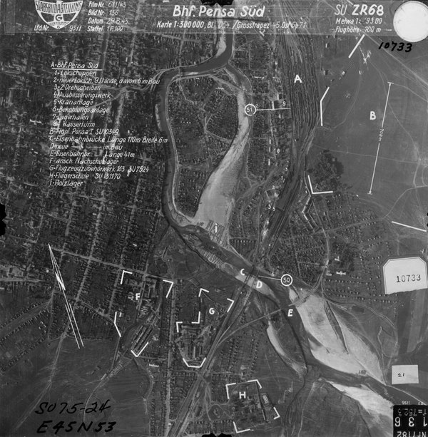В те годы на одном из домов около Драмтеатра (Пензенский драматический театр им. Луначарского, находится на пересечении улиц Кирова и Бакунина) был неброский указатель с надписью «бомбоубежище». Так вот на немецком снимке район Драмтеатра обведен, и это место у них называется «Хранилище запасов SU2349 „войеново свабшенья“ — хранилище продуктов питания для сухопутных войск» (Nachschublager SU2349 «Wojenowo Swabschenja» Lebensmittellager für Heeresbedarf). Несколько забавляет это «свабшенья». Видимо, с чьих-то слов на слух записывали…