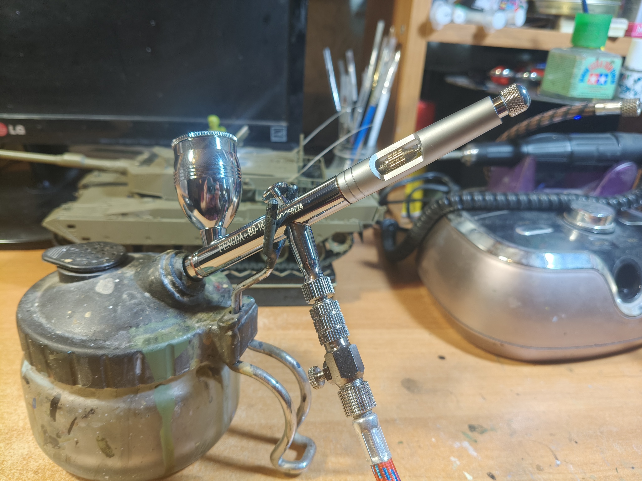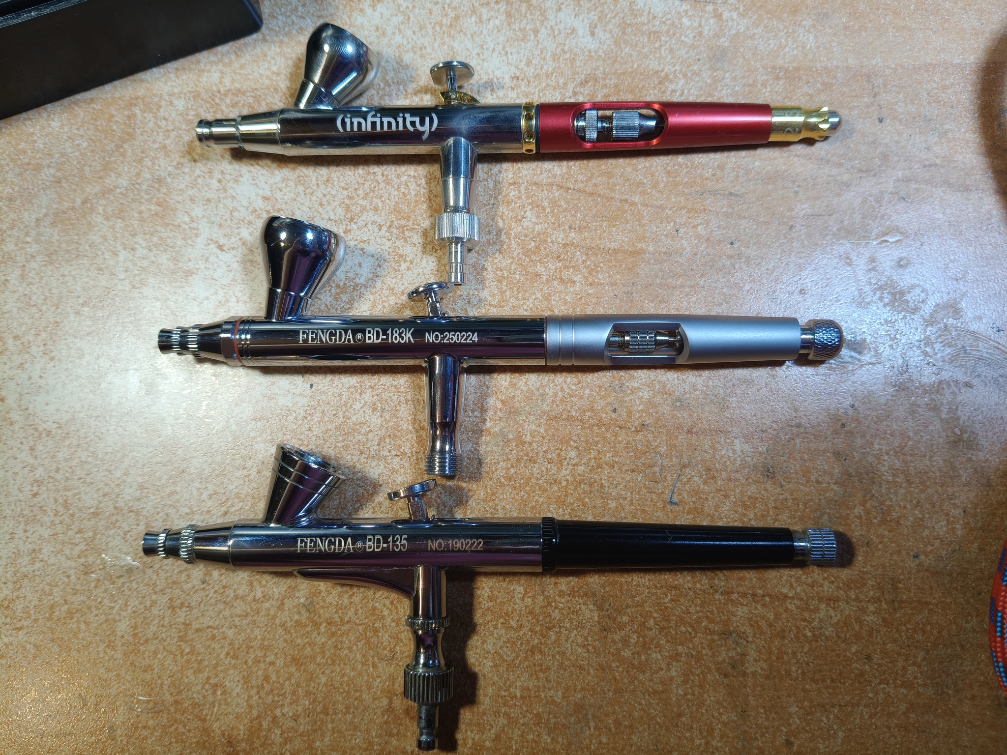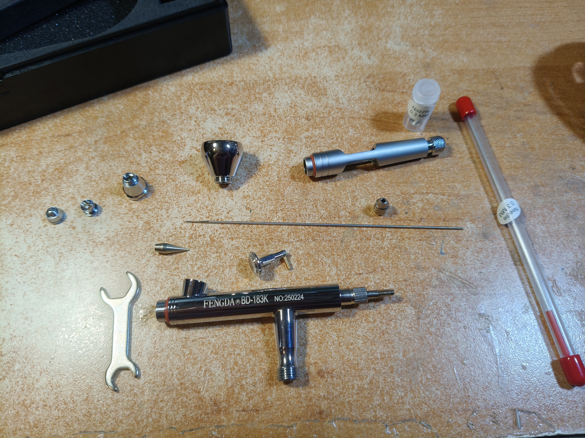 Приветствую, уважаемые подписчики, коллеги-моделисты и просто читатели! Долгое время я пользовался двумя китайскими аэрографами Fengda BD-130K и BD-135 (один для более тонких работ, другой для окраски по площадям и лакирования). Потом приобрёл себе замечательный германский инструмент Harder&Steenbeck Infinity 2in1 (0.15-0.4 мм). Но в следствие дороговизны Инфинити, а также дефицитности и снова дороговизны расходников на него, эту машинку я берегу и расчехляю только для самых тонких работ, буквально на каждой четвёртой или пятой модели, не чаще. И получается что я, имея классного дорогого немца 99% времени всё равно продолжаю красить старыми бюджетными китайцами. Проанализировав эту ситуацию, я решил купить себе "рабочую лошадку" уровнем повыше, но всё равно бюджетную - чтоб не жалко было пользоваться постоянно. Потому заранее прошу комментаторов не писать, что надо было брать Айвату, а это фуфло. Поскольку из всех китайских производителей в сфере аэрографии наиболее благополучный опыт у меня как раз с Fengda, я решил остановиться снова на их продукции, и выбрал модель с тремя диаметрами игл и сопел в комплекте. Что ж, посмотрим.