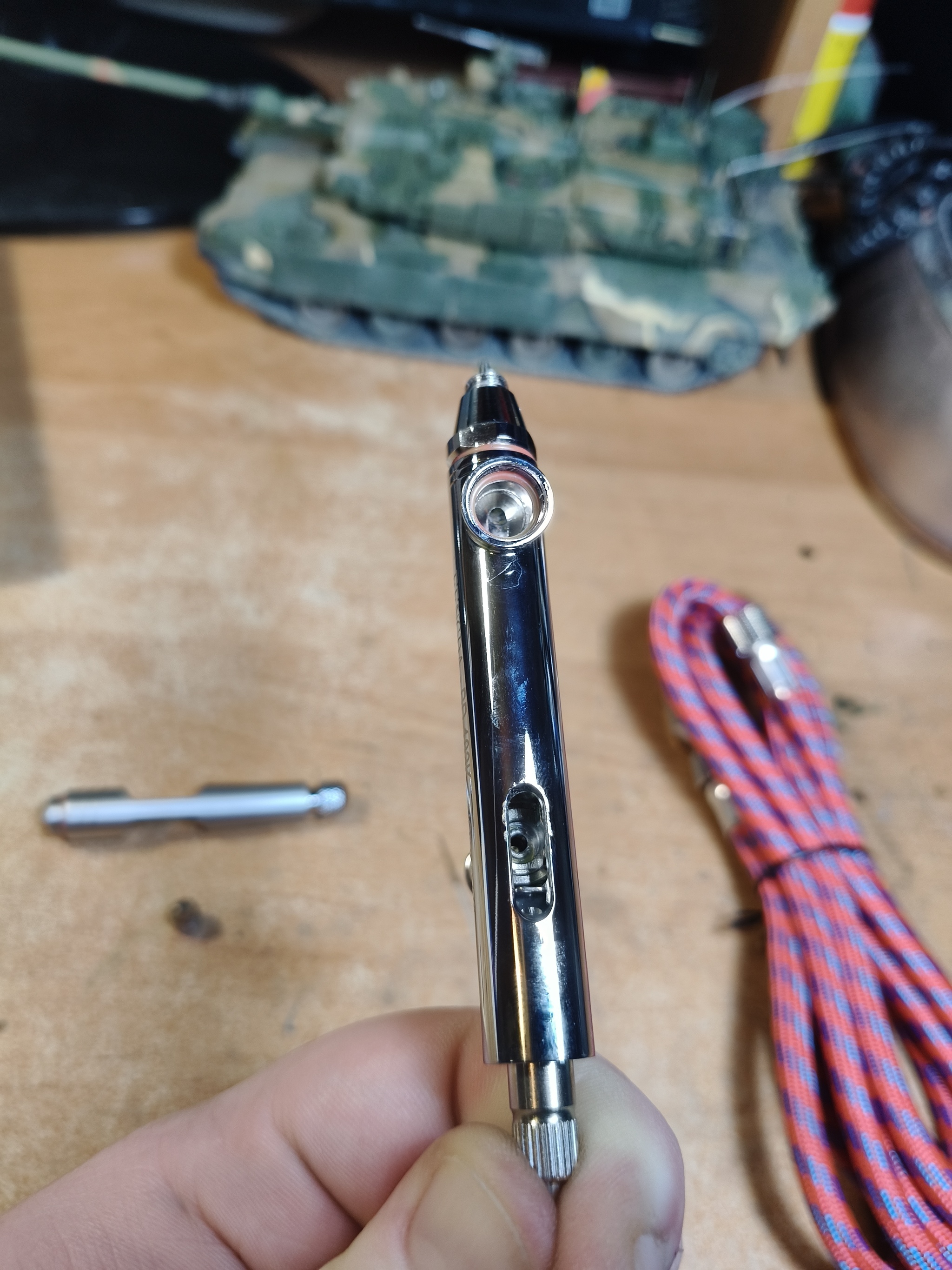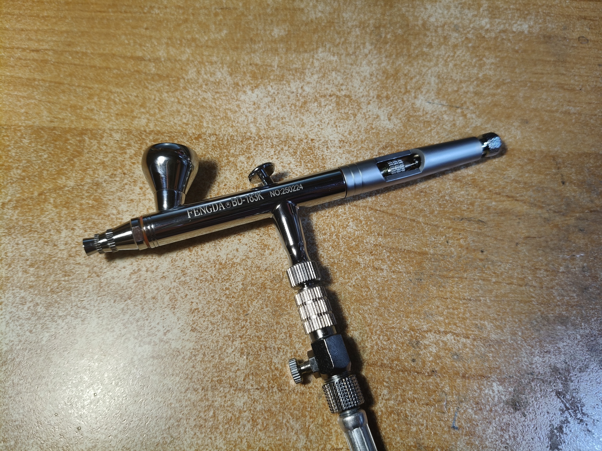 Ну и сам аэрограф поближе. Сразу скажу, что качество изготовления вполне приличное, также аэрограф увесистый, значит отлит из латуни, а не силумина. Я так понимаю, это копия какой-то Айваты. Был на маркетплейсе и закос под мой немецкий Инфинити примерно за те же 40 баксов, но я решил взять эту модель из-за комплекта сопла и иглы диаметром 0.8 мм и бачка на 13 мл в комплекте. Когда работал с орнитоптерами понял что сопла 0.5 и среднего бачка иногда не хватает, а у меня в коллекции ещё будут модели размерами намного больше стрекоз из "Дюны".