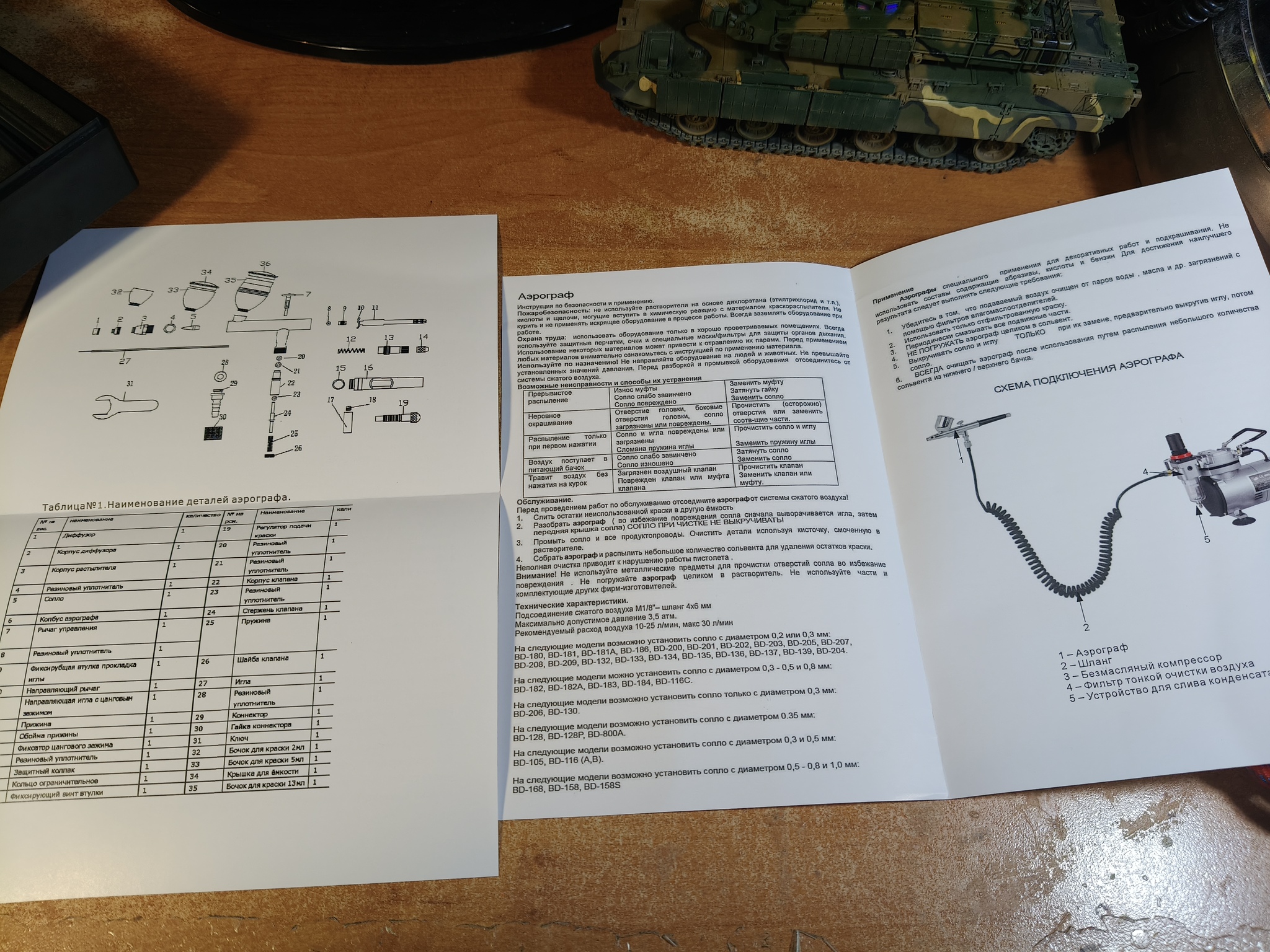 Комплектация поставки (с торгового сайта): аэрограф, сменный распылительный комплект: сопла/иглы 0,3мм; 0,5мм; 0,8мм, комплект съемных емкостей 2мл; 5мл; 13мл, шланг для аэрографа длиной 1,8 м с гайками G1/8"-G1/8", ключ для смены сопла, пипетка, инструкция, футляр, коробка