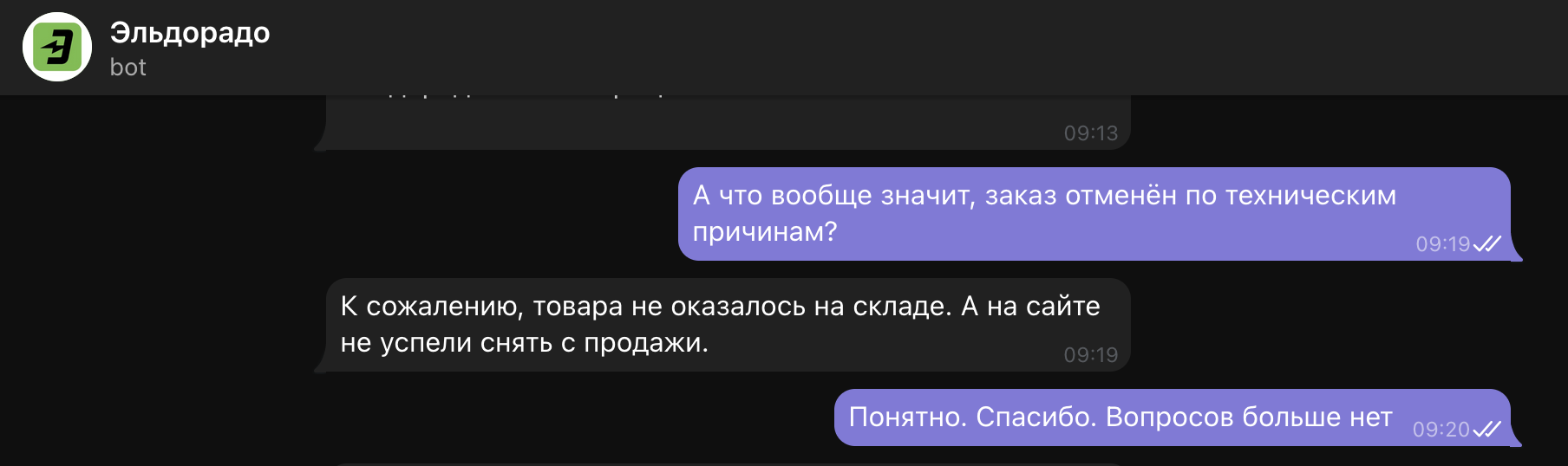 Прислав промокод на 500 баллов. Сейчас напишу досудебную претензия по поводу того что отменили заказ без моего согласия