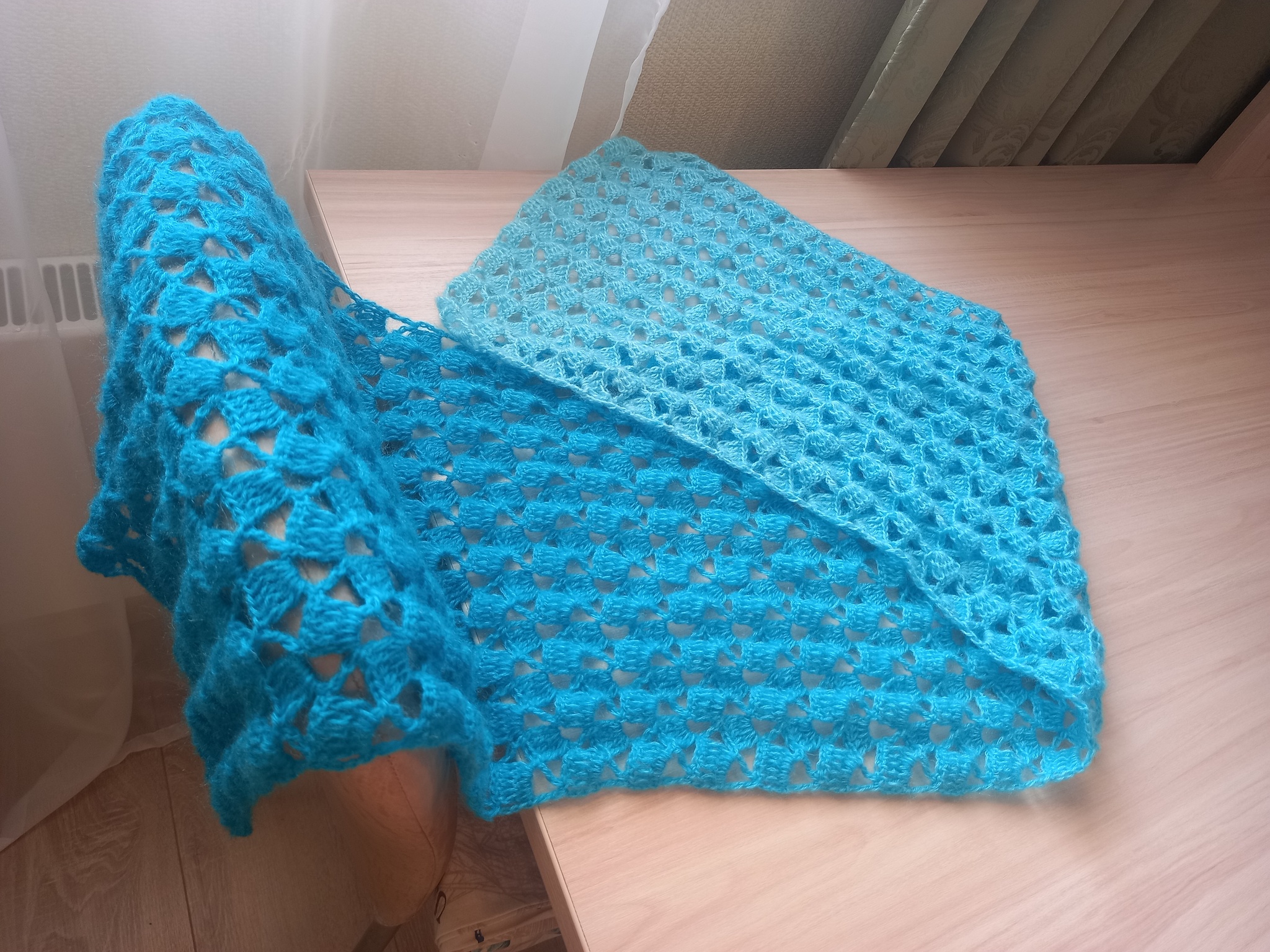 Пряжа Ализе, ниточка тонкая, но очень пушистая. Цвет переходящий от нежно-голубого, до насыщенного синего. Несмотря на то, что шарфик вышел нежным и ажурным, он очень тёплый. Пока вязаная его, чуть не померла от жары ))