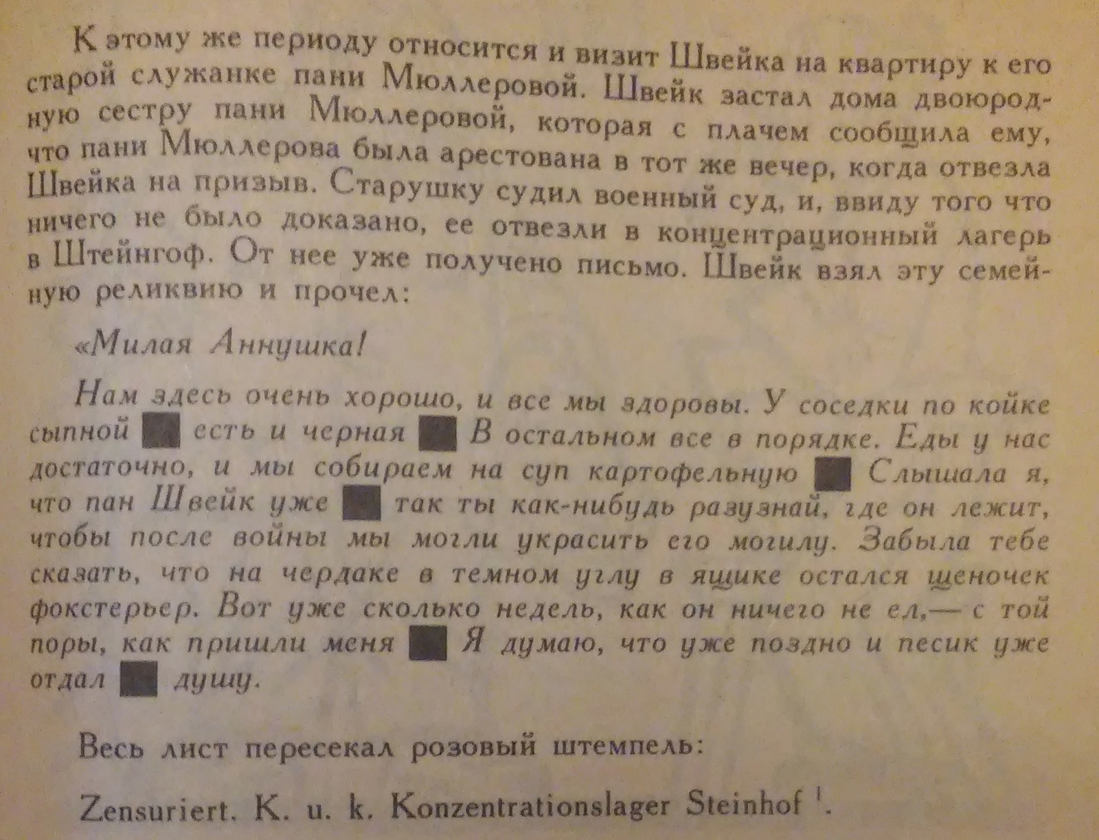 Особенно заботится обо мне сержант (вычеркнуто) – пожалуйста, не забудь эту фамилию. Вчера он мне сказал: «(вычеркнуто) козла вонючего (вычеркнуто) до самого дембеля!» Но я на него (вычеркнуто) не обижаюсь, потому что ведь иначе действительно (вычеркнуто).