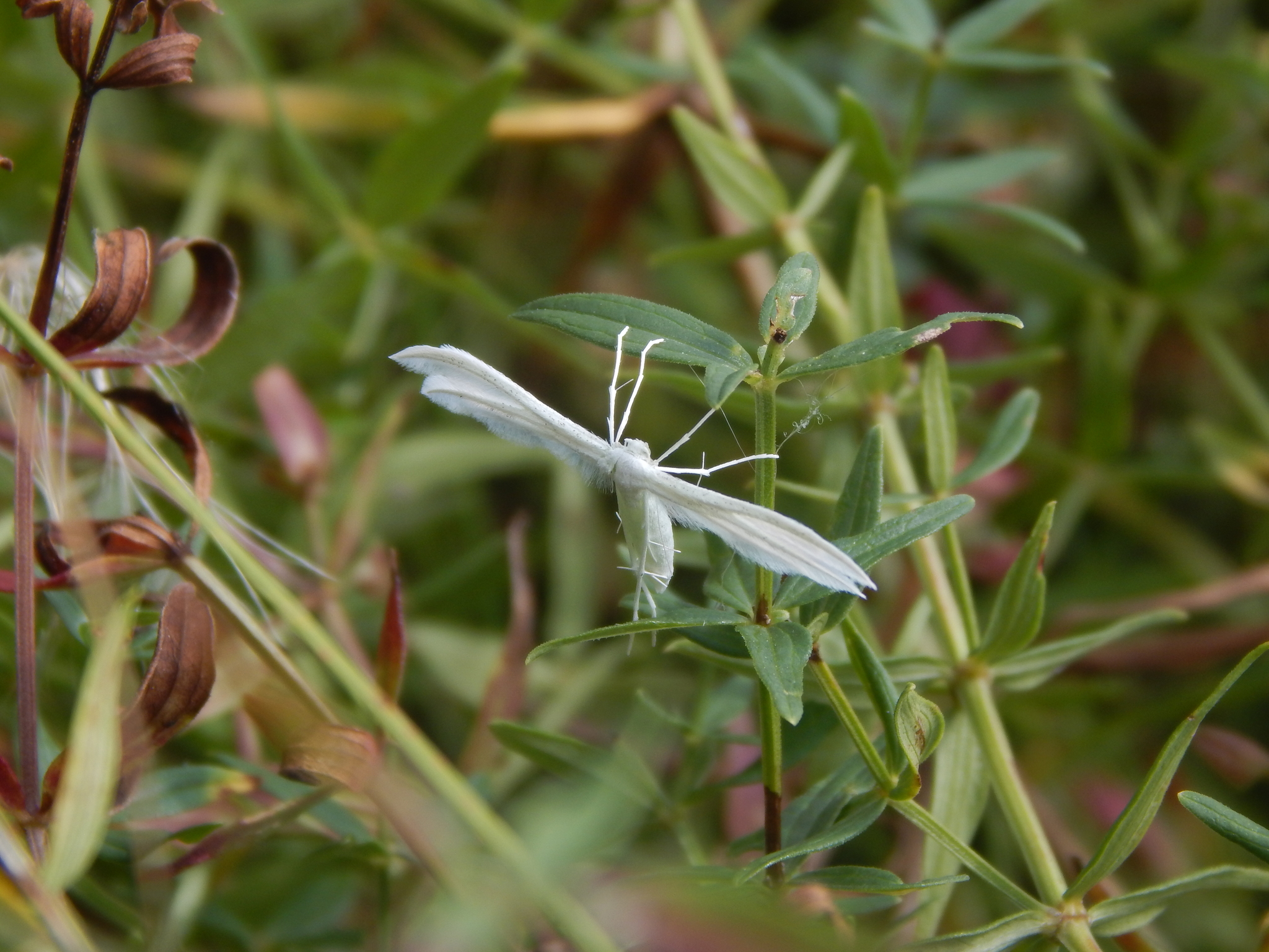 Начнем с довольно нестандартного представителя отряда Чешуекрылых - бабочка белый птерофор. Когда я ее увидела впервые, я даже подумать не могла, что это бабочка. Но на всякий случай сфоткала, чтобы выяснить. И действительно оказалось - бабочка, представитель семейства Пальцекрылок. Любит сухие луга, сады и поля. Гусеница жует листья калистегии, вьюнка и щавеля. Имаго не питается.