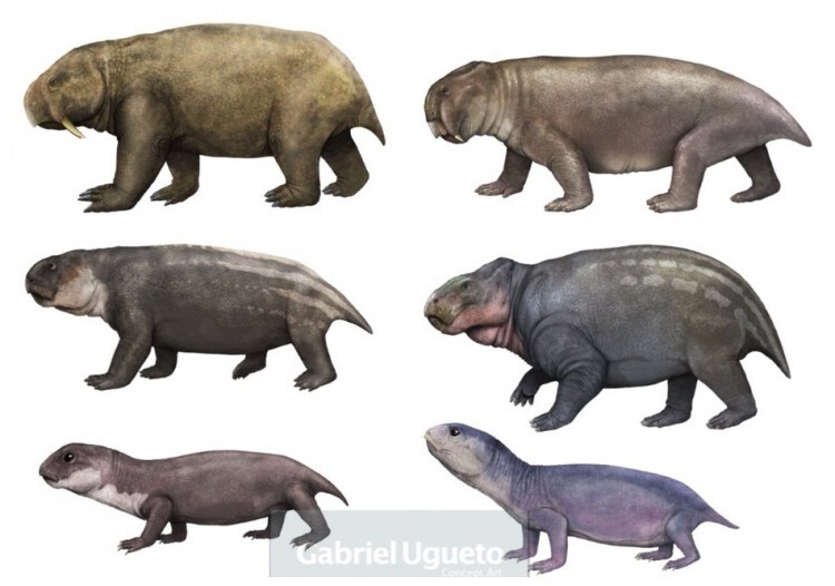 Реконструкция разных видов дицинодонтов: средний размер с крупного кабана, очень крупный зверь, и мелкое животное