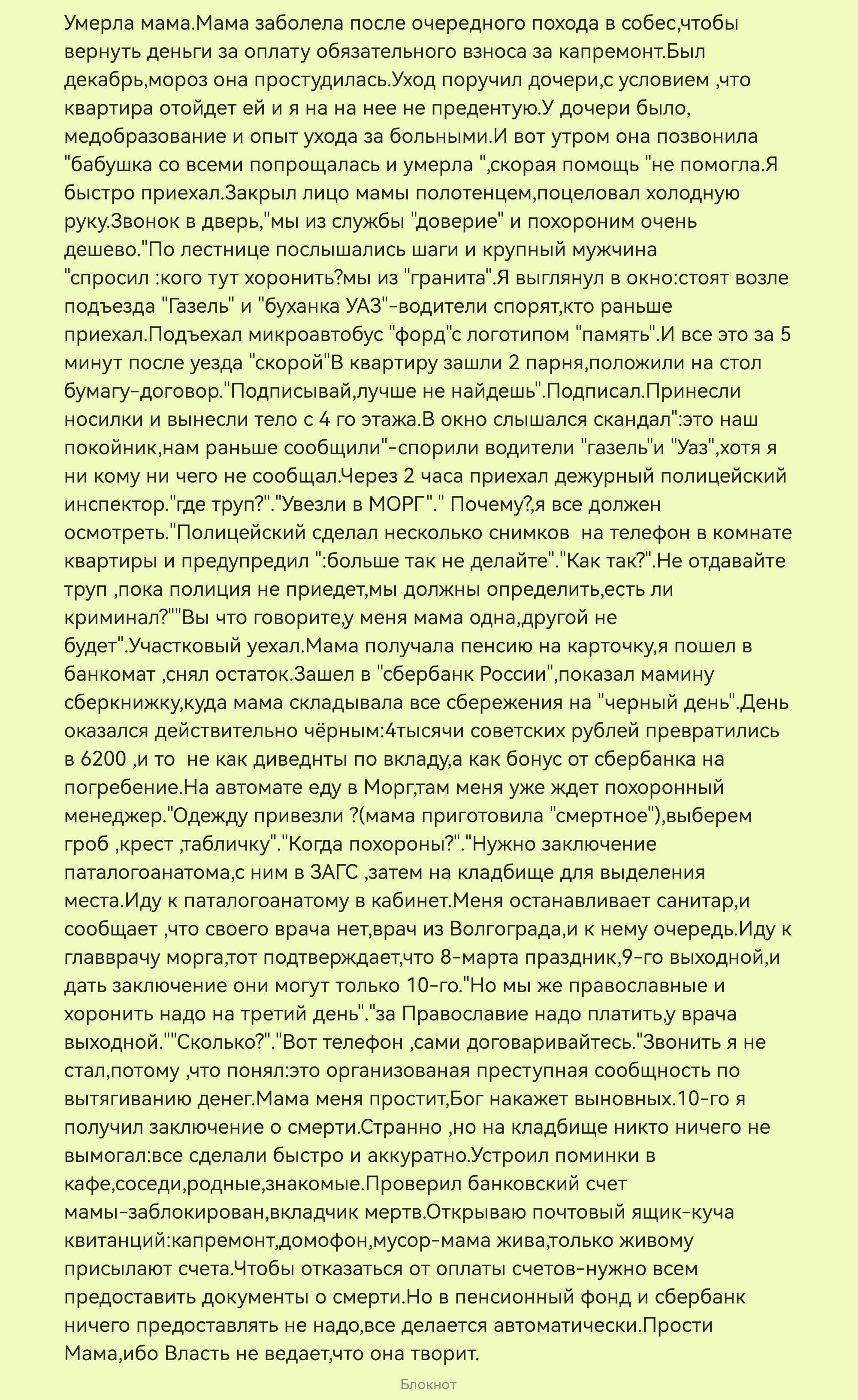 7. Возвращаясь обратно в квартиру, я созвонился с похоронным агентом и сказал, что справка из полиции у меня. Он ответил, что отправляет катафалк на наш адрес за телом. В течение часа приедут. Во дворе дома мне было еще предложение от альтернативной похоронной бригады, но я вежливо свернул разговор.