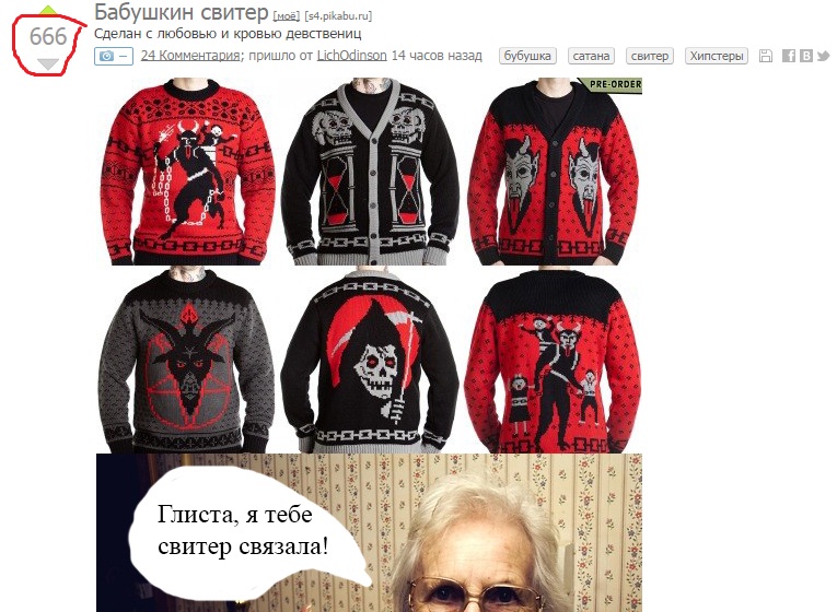 998 LichOdinson Бабушкин свитер 11 лет назад Сделан с любовью и кровью девствениц [моё] Бабушка Сатана Свитер Хипстеры