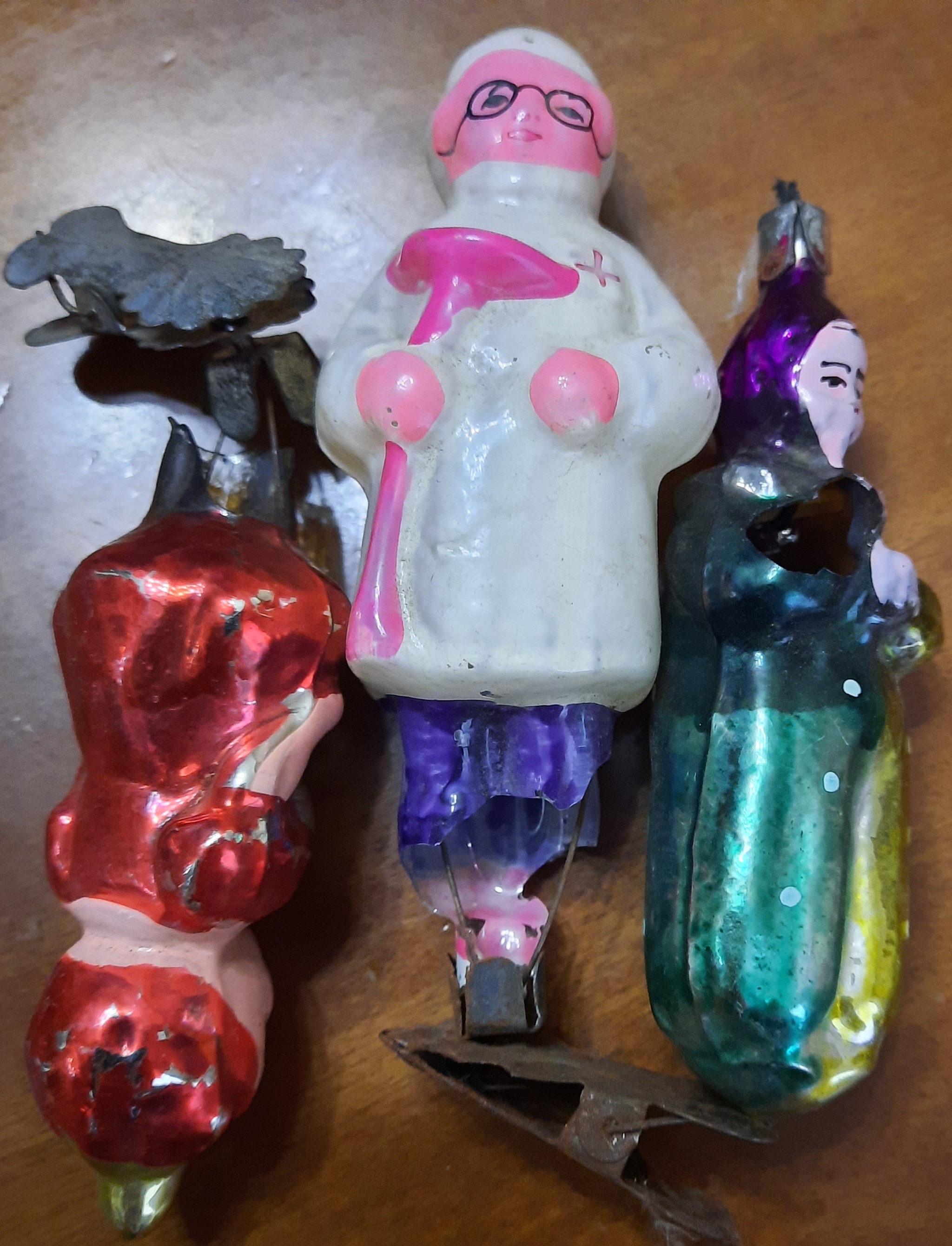 Редко, кто из таких продавцов занимается оценкой каждой игрушки по-отдельности. Так и продают-вперемешку: целые и битые, стеклянные и ватные, конфетти, серпантин, запутаная гирлянда, макушка на елку, иногда маска. Ценные игрушки встречаются редко, поэтому такие коробки не идут "нарасхват", но иногда могут заинтересовать "перекупа" или ценителя, который ищет, к примеру, добор комплекта. Обычно, в такой коробке умещается несколько десятилетий игрушек: редко-довоенные, обычно-послевоенные, 50-е, 60-е и так далее. Игрушки разбивались, и человек вынужден был подкупать по несколько штук каждый год. Как правило, на границе 90-х покупки прекращались. Видимо, человек довольствовался тем, что есть, а может уже не ставил елку-уже никому это было не нужно или не было сил и времени. А может просто заводил коробку с новыми игрушками, а эти отправлялись в чулан, нельзя сказать до лучших времен, ведь считалось, что их время прошло, но по принципу "вдруг пригодятся". Как правило пригождались уже только для продажи. Коробкой.