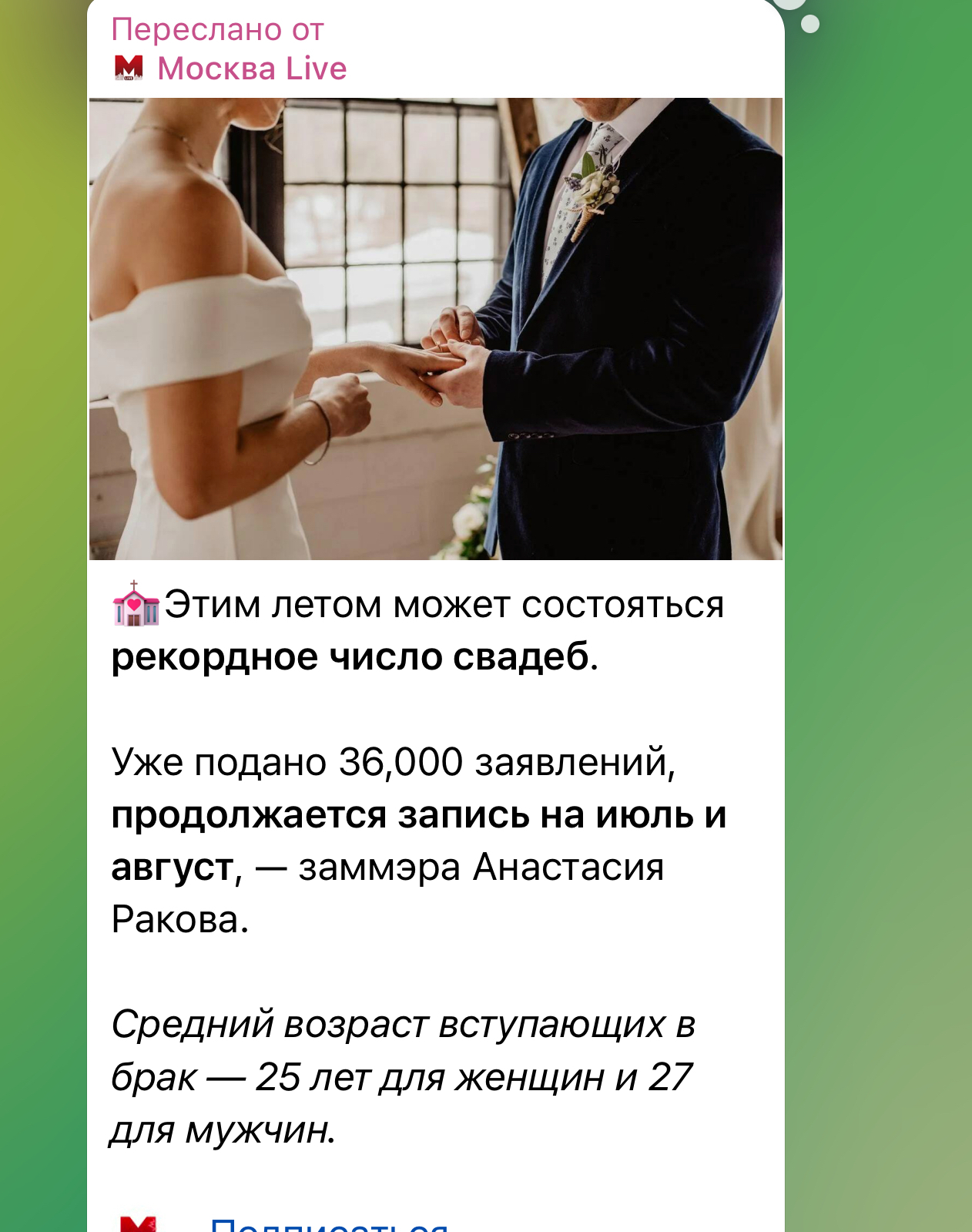 Тут пост вышел, что ожидается огромное кол-во свадеб летом. Встречаются годные комментарии