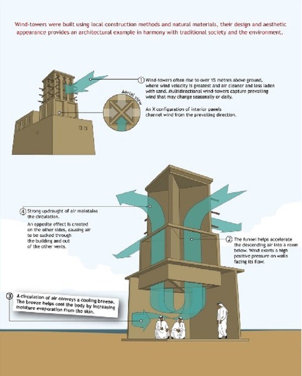 При этом, бадгиры — это не просто вытяжка. Благодаря размерам и расположению в самом сердце здания, они постоянно охлаждают его поверхности. Жар от стен передается врывающемуся ветру и также выходит наружу.