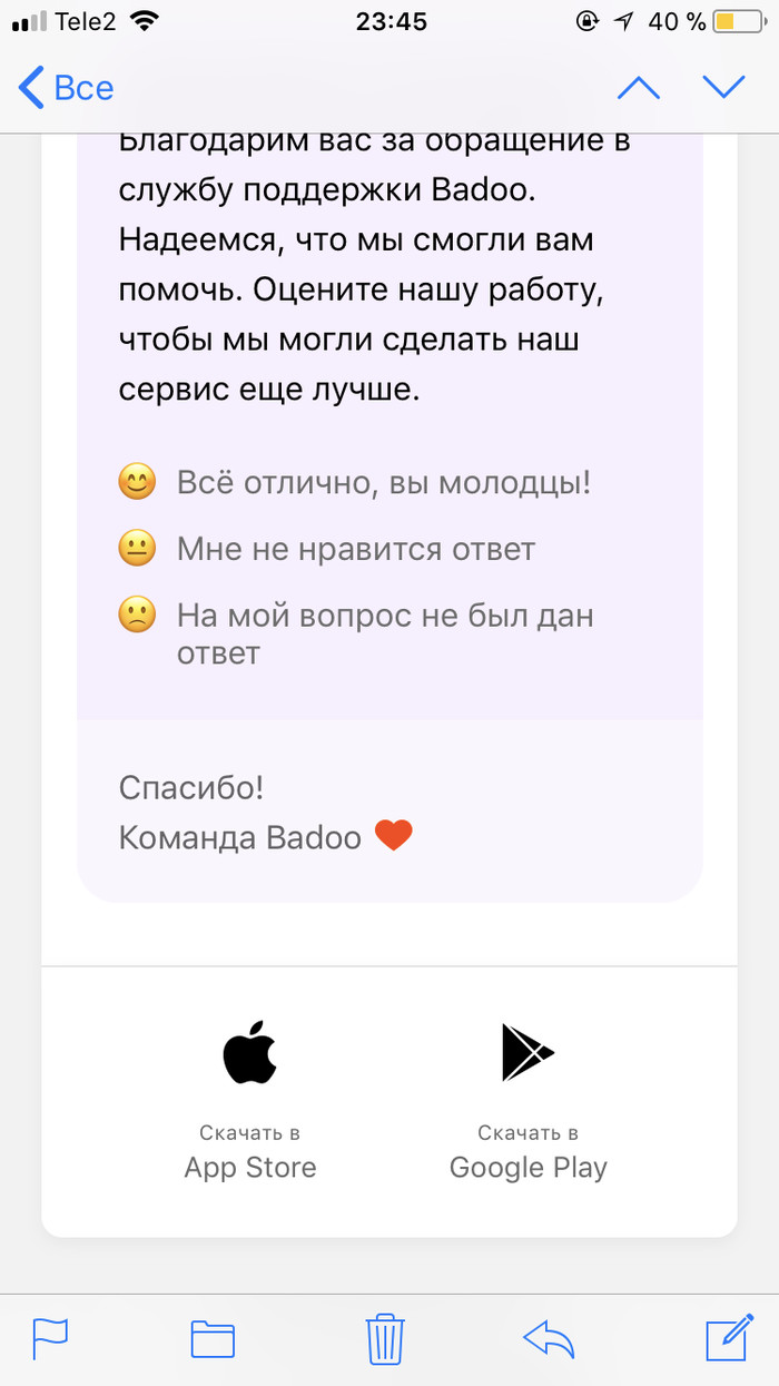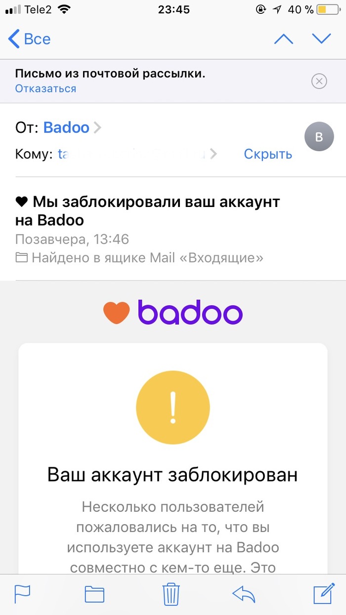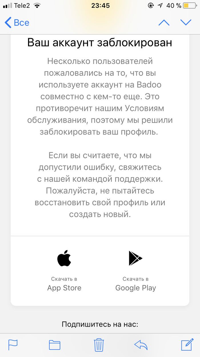В этом письме была просьба оценить качество работы службы поддержки и естественно я поставила им самый грустный и недовольный смайлик, а также написала, что я недовольна их работой и ответа на свой вопрос (хотя бы ответа!) я так и не получила. До часу дня понедельника от Badoo была тишина,до известия о том,что мой аккаунт заблокирован: