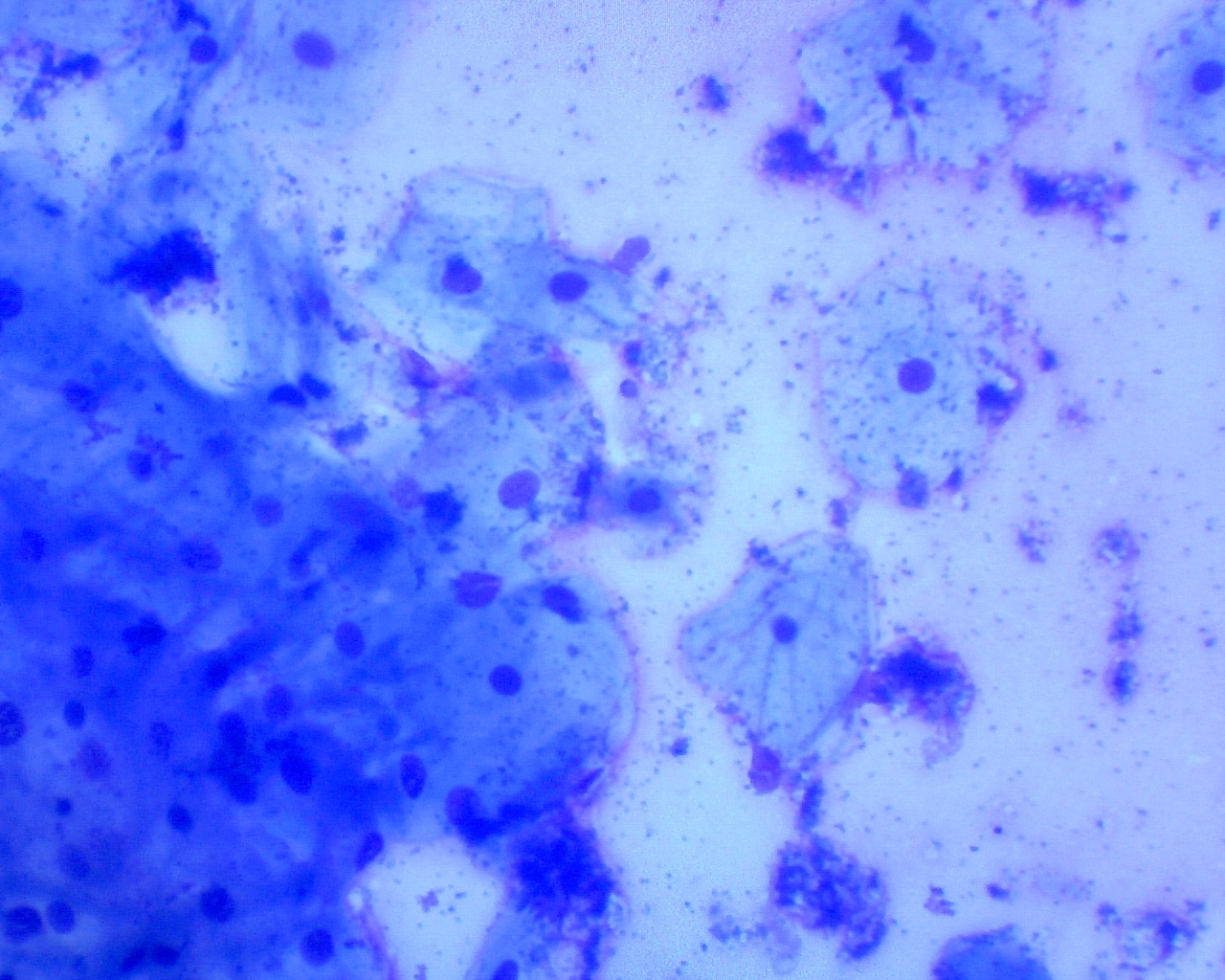 При небольшом увеличении (x400) хорошо видно клетки эпителия и их ядра (синие крупные точки)