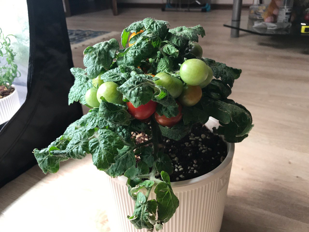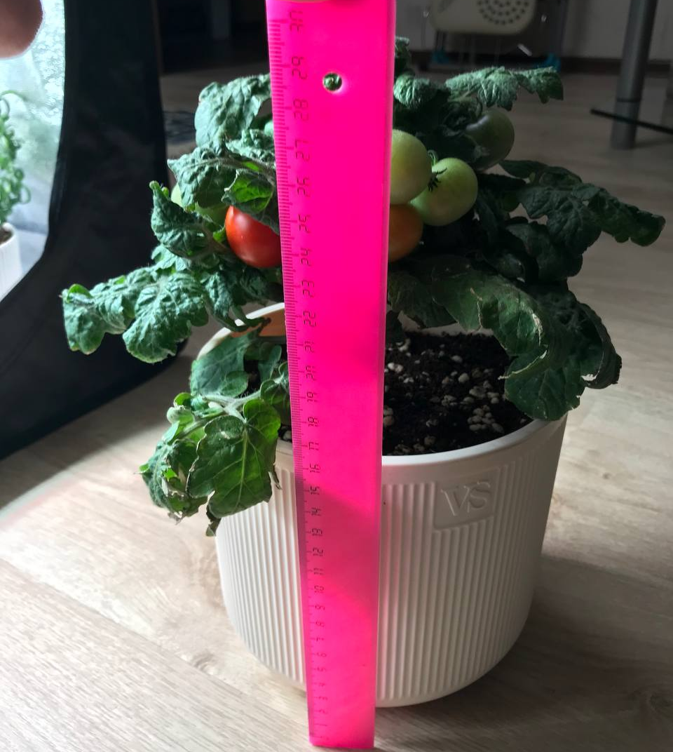 В первых числах января помидор начал родить плоды и окончательно остановил линейный рост. Из-за мощного светового потока или из-за особенностей конкретно этого куста - загадка. Т.к. повторюсь, бывало вырастали и лианы по 70 сантиметров.