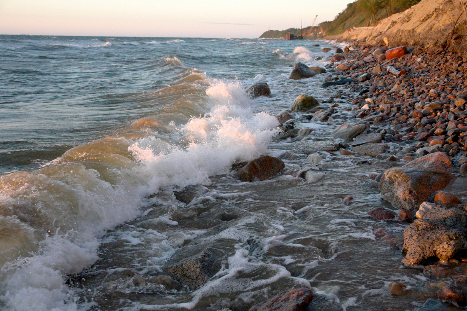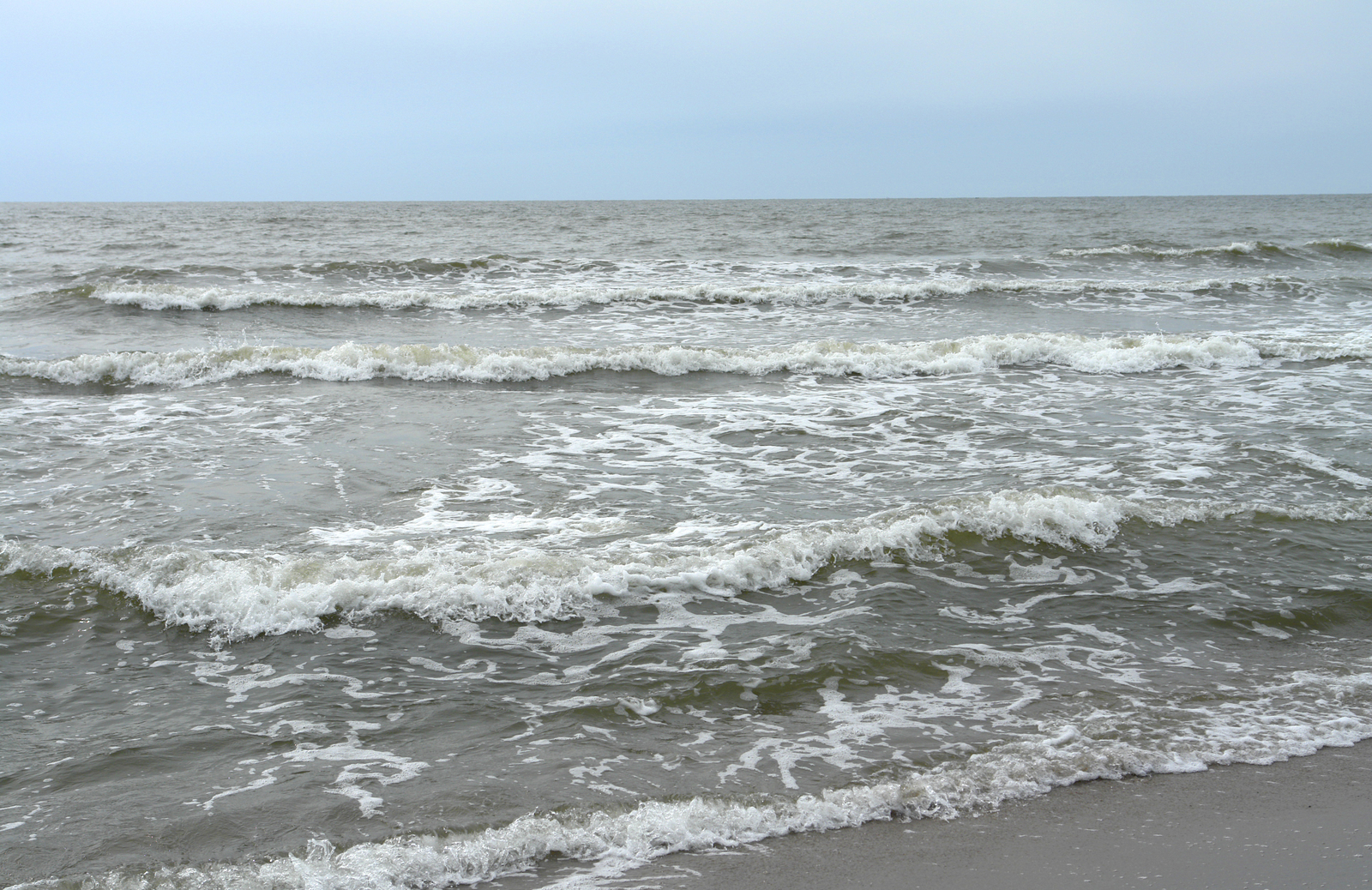 Пятая встреча - Янтарный. Пасмурный день, почти штиль. Море кажется каким-то сонным. Волны ленивые, вода вполне теплая, можно окунуться, море не обидит. Но пасмурная погода не очень располагает к купанию.