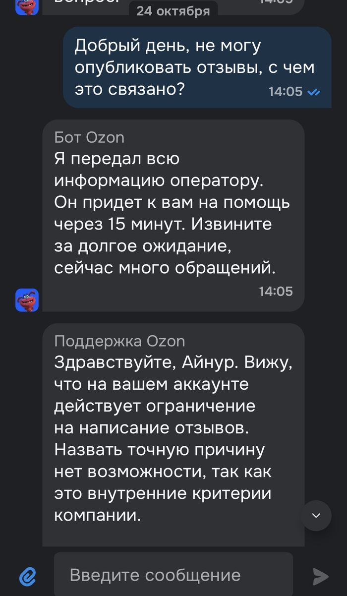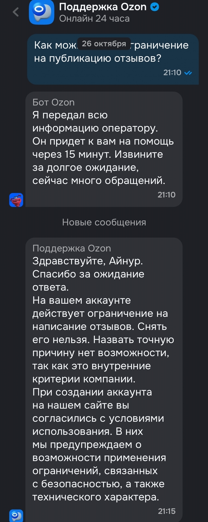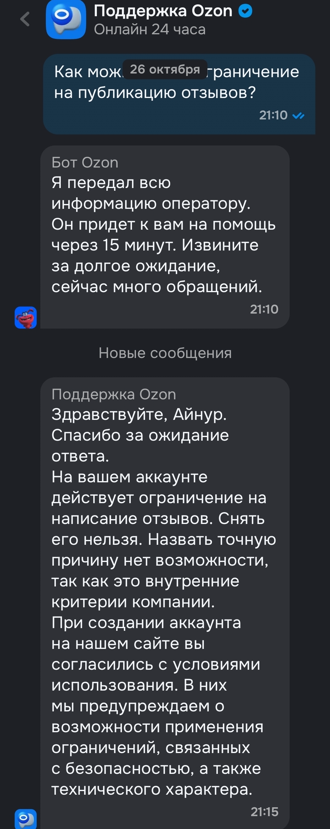 Мне дали бан на написание отзывов в OZON. Казалось бы, что такого?) Но на озон есть такая фишка, как баллы за отзывы: покупаешь определённые товары, пишешь отзыв, и получаешь баллы. Которыми, кстати, можно оплатить всего 25% от стоимости.