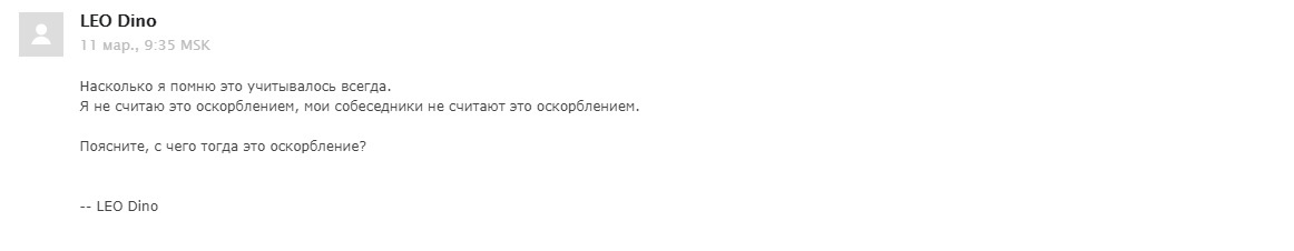 На мой вопрос "А как можно говорить что действия модератора были верные, если оскорбления не было, а меня за него отправили в бан?" ответа не было (спам проверил=)