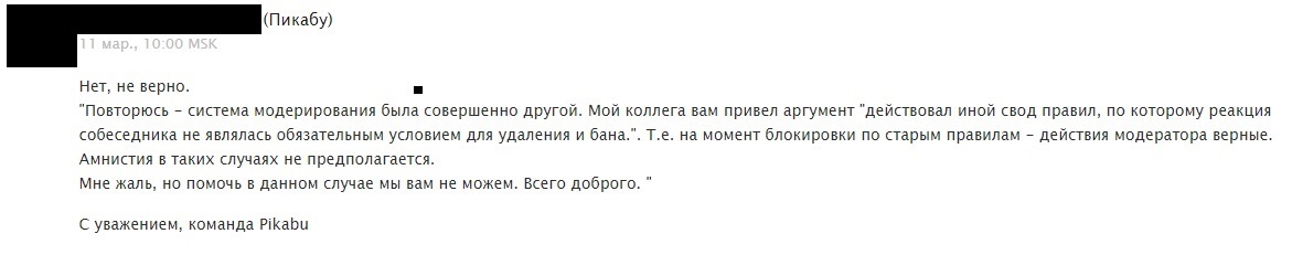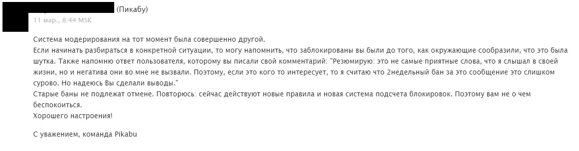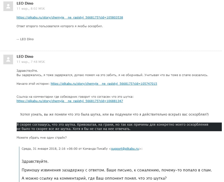 Я переписывался с командой Пикабу, но сначала моё сообщение попало в их спам, и они не сразу мне ответили, а потом и их сообщение попало в мой спам, о чем я не знал. Я же тогда решил что на меня просто забили и сидел две недели в бане, надеясь разобраться с тем что произошло когда выйду с него, чем я и занялся. Первое что я хотел узнать, оскорблены ли мои собеседники, ибо если да, то я должен был первым делом перед ними извинится, ибо никак не хотел их обидеть, а не в поддержку писать.