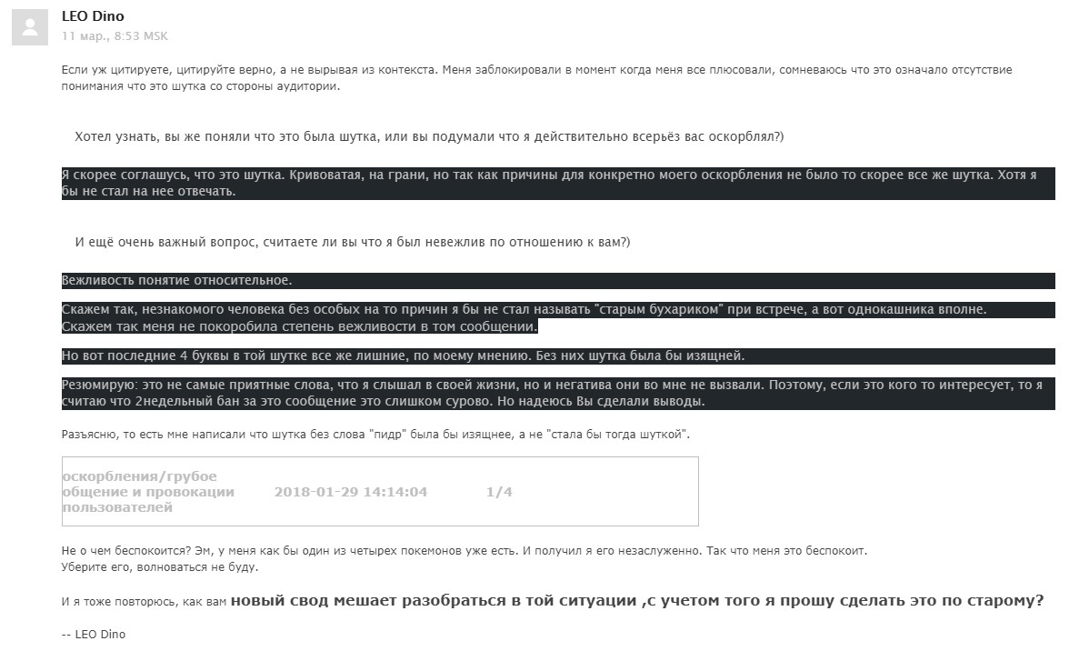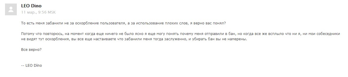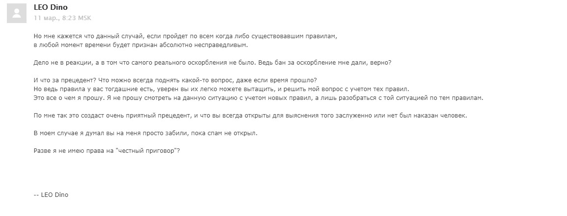 Если один из моих собеседников #comment_105803538 сам начал меня защищать (безрезультатно), то как оказалось второй собеседник даже не видел ни моего сообщения, ни того что меня забанили. В этом же комментарии вы сможете увидеть за что именно меня забанили (хорошо еще у меня тупая привычка делать скриншоты шуток, и отравлять друзьям по вотсапу).