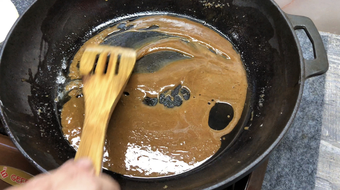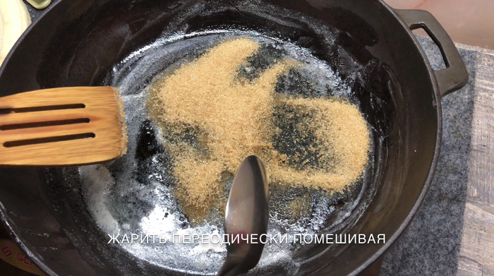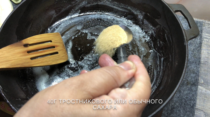 3) Добавим 40г тростникового или обычного сахара и периодически помешивая доведем до жидкого состояния (карамель)