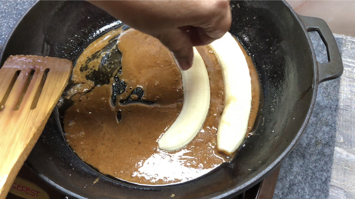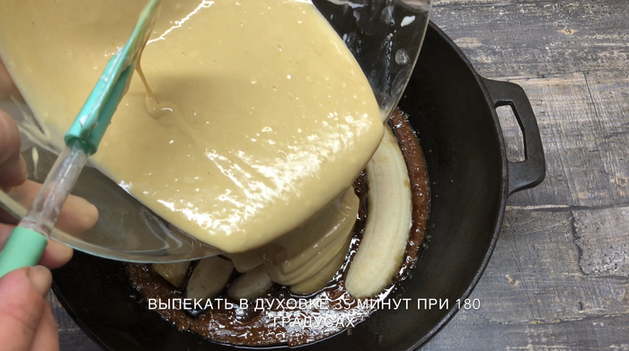 8) Перемешаем и зальём этим сковороду с нашими бананами
