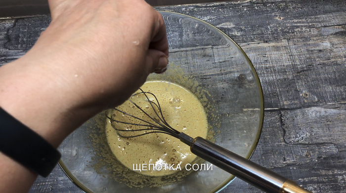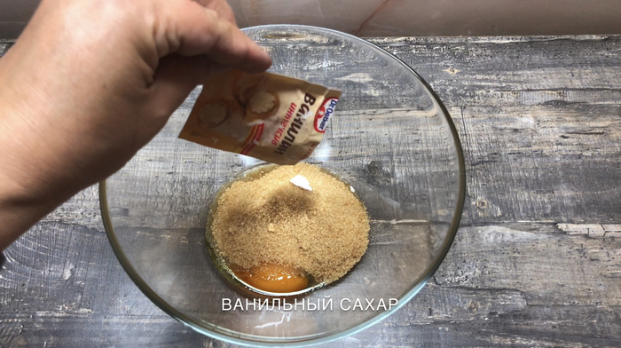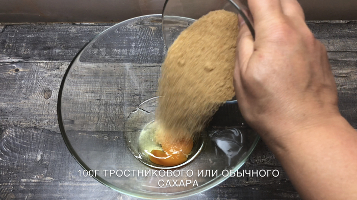 5) В одной миске смешаем 1 яйцо , ванильный сахар(по желанию) , 100 г тростникового или обычного сахара и щепотку соли