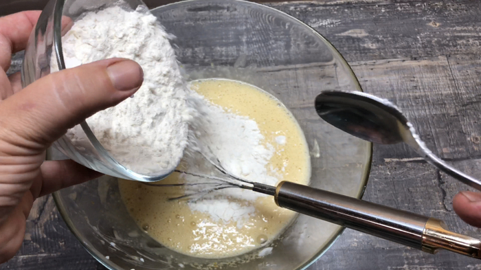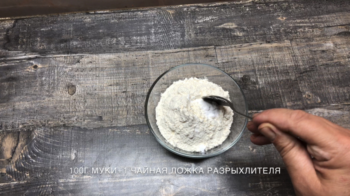 7) Добавим 100 г муки и 1 чайную ложку разрыхлителя