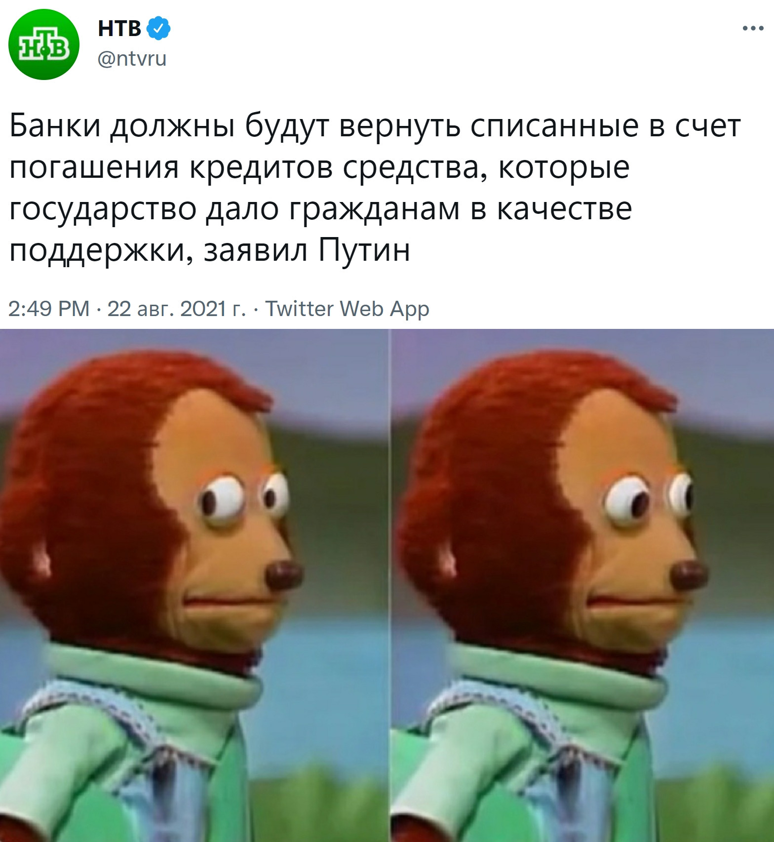 3917 FancySunny Политика Банки должны будут вернуть средства гражданам 4 года назад via Россия Политика Банк Кредит Деньги Владимир Путин НТВ X (Twitter) Общество Государство Поддержка Скриншот 55 13 10 3 1 Ещё 0