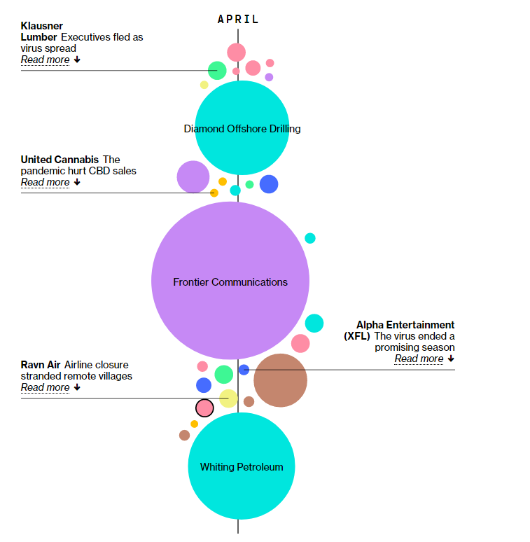 6. В целом, банкротства "хромых лошадей" меня не пугают. Это оздоравливает экономику. Неэффективные компании умирают, их место занимают более эффективные. Это естественный процесс, и (как это цинично ни звучит) лучше пусть банкротятся, чем их будут спасать. С 1 марта уже более 160 публичных компаний разной величины обанкротились, и это ещё не конец. Приведу несколько скриншотов: