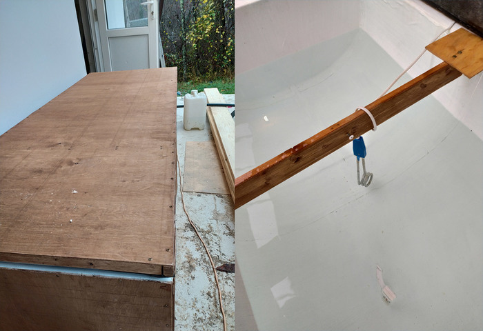 Чем греть воду вместо костра? Кипятильником. Как сделать, чтобы тепло из чана не уходило? Добавить теплоизоляцию. При этом чан должен быть переносимым, но свободно вмещать человеческую тушку, чтобы плавала, не касаясь стенок. Увы, ни акриловых ванн, ни пластиковых бассейнов с нужными параметрами нет, поэтому я быстро сделал каркас из реек и фанеры. Получилось три шпангоута, два карлингса по низу, бортовые стрингеры без усиления и плоские тупые форштевень с ахтершетвнем. Фото не сохранилось, в терминологии могу ошибаться, т.к. по морям не плавал и даже не ходил. Каркас был покрыт половой гидроизоляцией и сверху - резиновой акриловой краской.