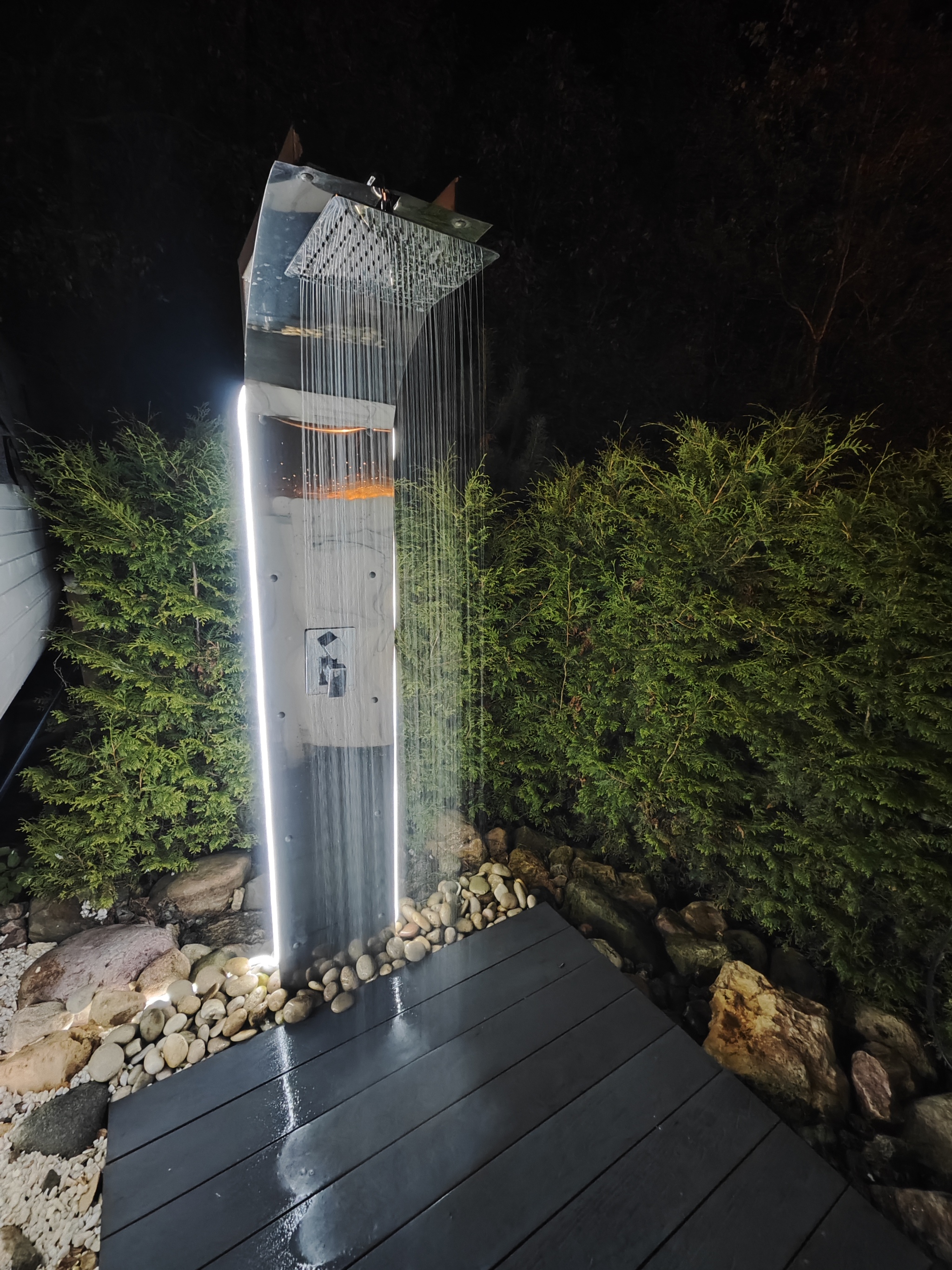 Душевую муж оборудовал на улице. Душ с подогревом, стоит проточник. Зимой её заменяет снег 😁