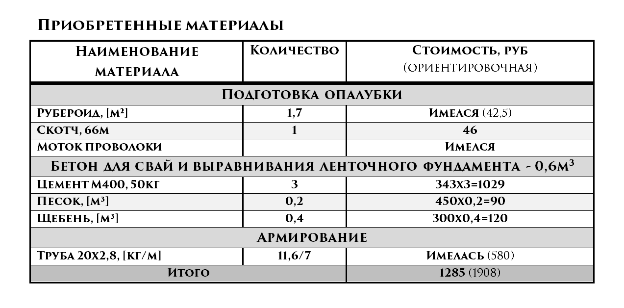 Как всегда в конце приводим объемы и стоимость приобретенных материалов.