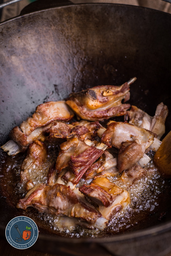- Поджаренное мясо сложить в казан, приправляя перцем, солью, растертой зирой и кориандром.
