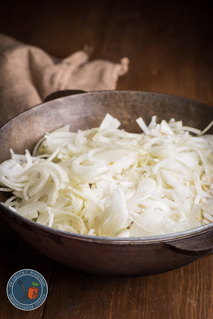 - Сверху, шапкой, сложить лук. Лук можно еще присолить. Не перемешивать.