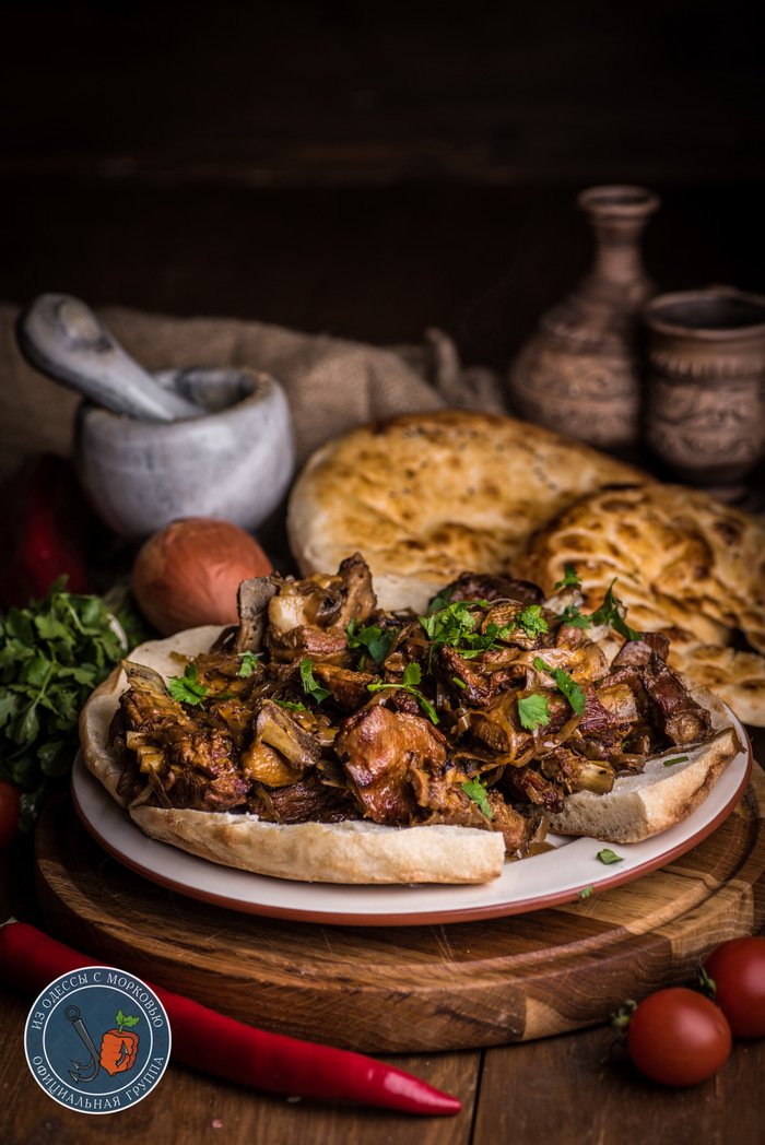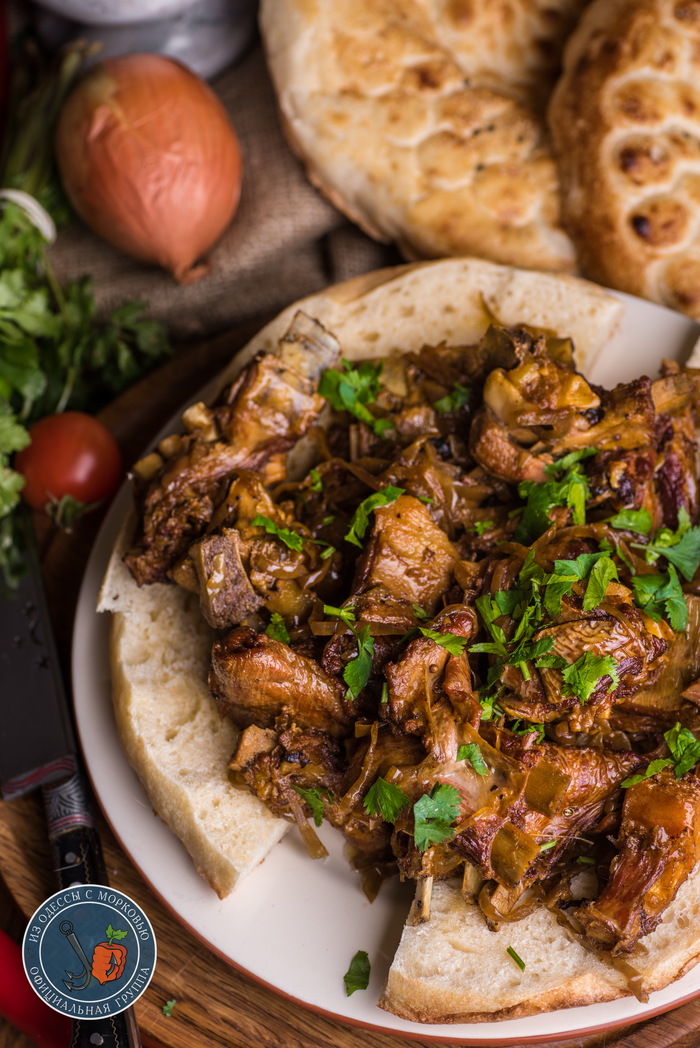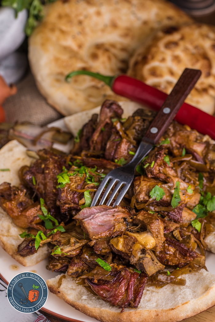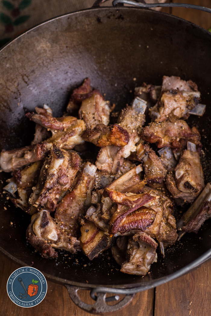 Выводы: что тут скажешь -простая, но добрая и душевная еда. Лучше всего конечно, такое делать не дома на плите, а на даче или природе. На живом огне и на свежем воздухе все получается лучше. А так, берешь кусок лепешки, кладешь сверху пару ребер и красота. И вроде уже и проблемы не проблемы и воздух ,как детстве и вроде не все так и плохо. А потом здорово макать хрустящей корочкой с луковый соус на дне казана и закусывать кинзой или молодой редиской.