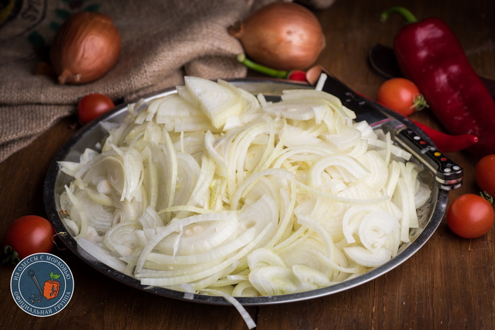 - Пока ребра жарятся, нарезать лук полукольцами