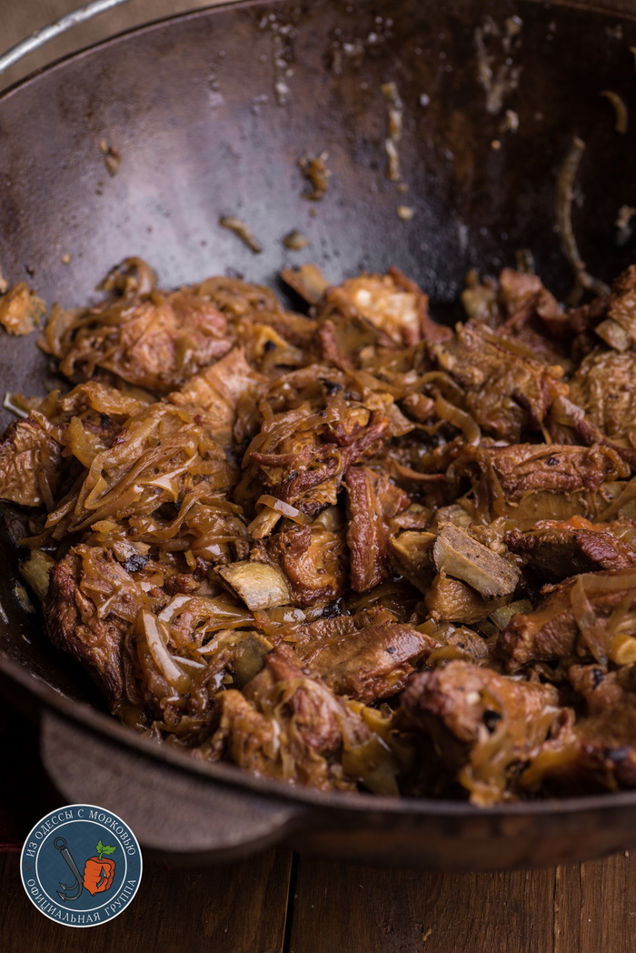 - Время прошло и из под крышки пробивается манящий аромат тушенного мяса и зиры? Все, значит время все тщательно перемешать, пробовать, понять, надо ли готовить еще и выправлять на соль и черный перец. Идеальное мясо должно быть ультрамягким, а косточка легко выниматься. По желанию, можно готовить еще минут 10, чтобы лук потемнел и карамелизовался в мясных соках еще больше.