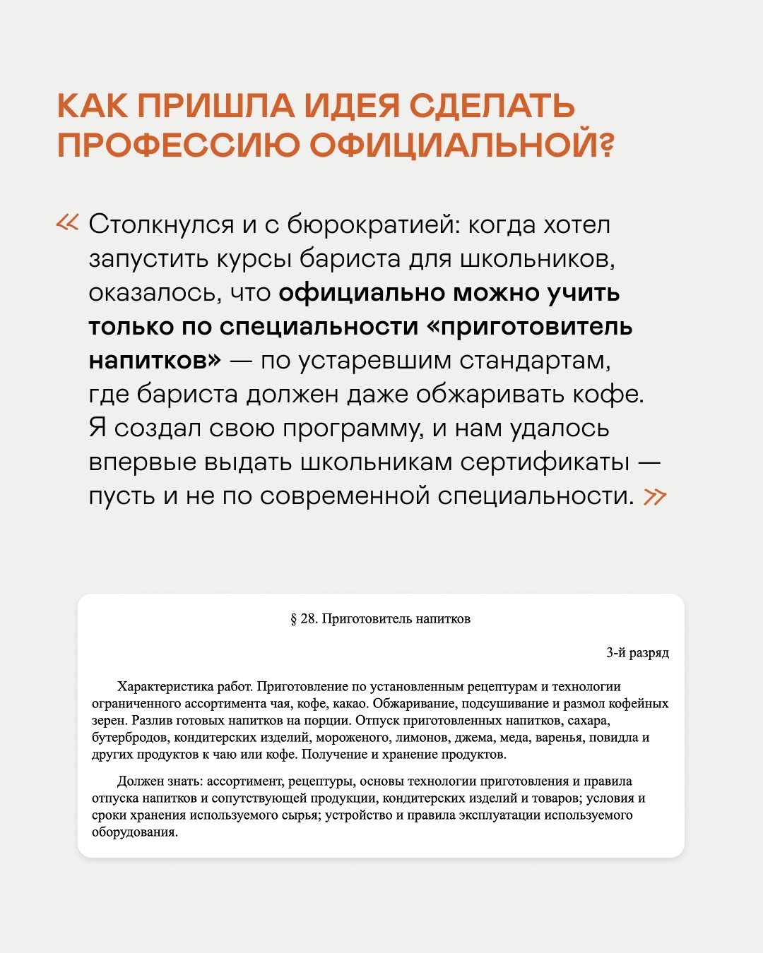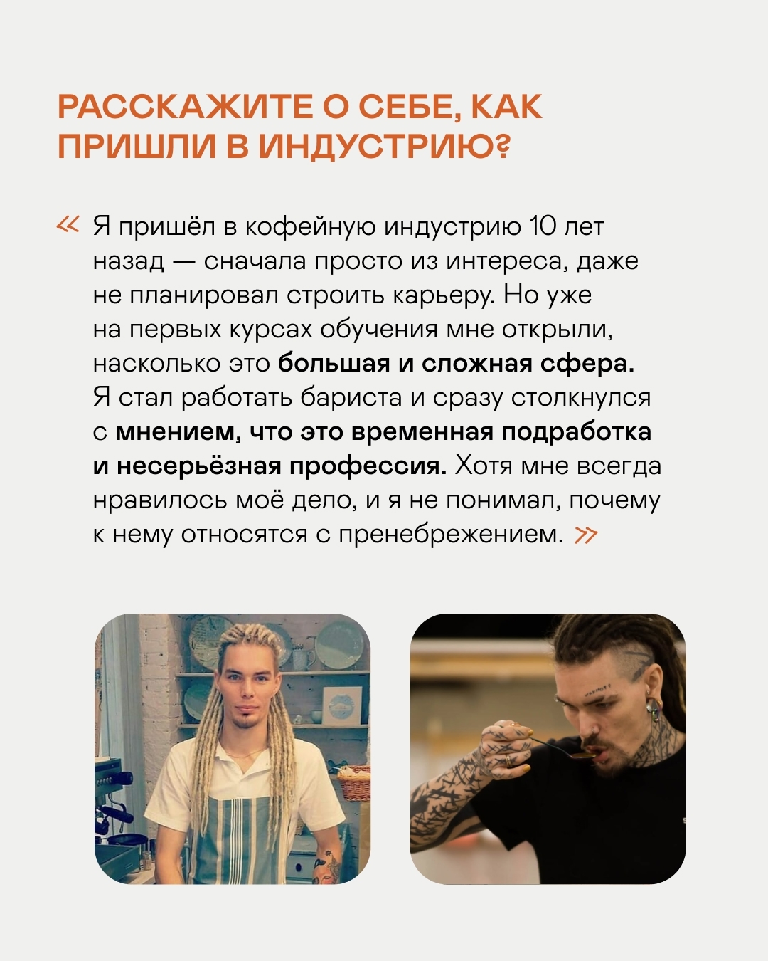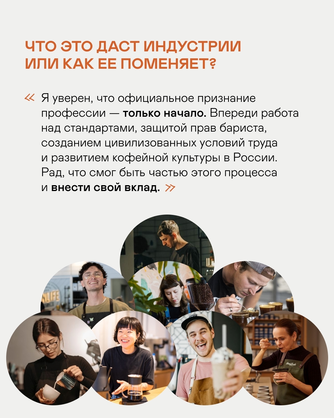 Более 10 лет я работаю с кофе. Начинал как бариста в небольшой кондитерской, а в этом году добился того, чтобы профессия бариста стала официальной в России.