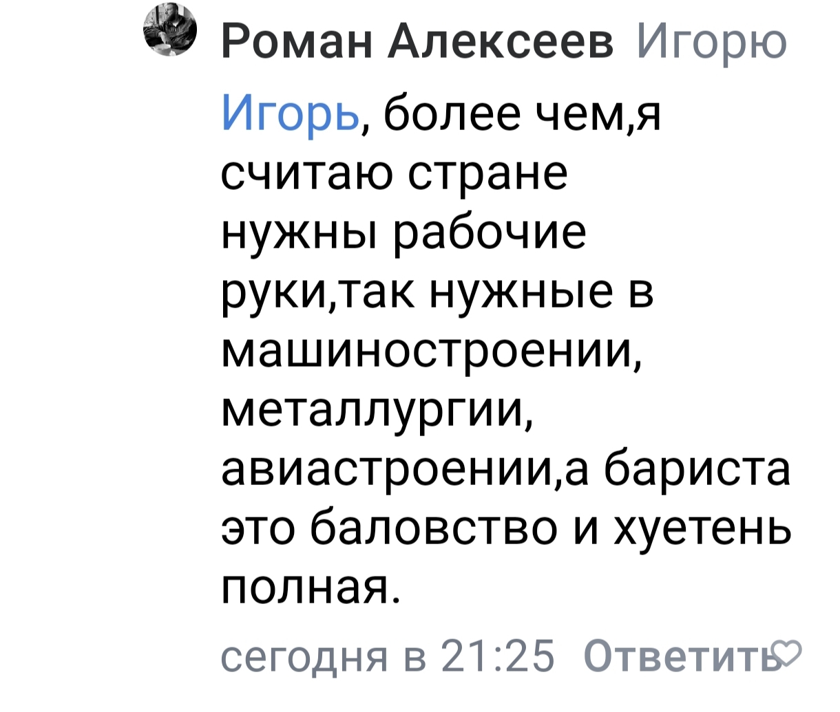 Все профессии нужны, все профессии важны... Уже треть жизни я занимаюсь кофе, но люди до сих пор считают это баловство и хуетень. При этом кофейная индустрия России действительно одна из самых сильных. У нас есть чемпион мира по приготовлению кофе в турке, два чемпиона мира по обжарке зерен кофе, чемпионка мира по латте арту и прочие и прочие достижения.