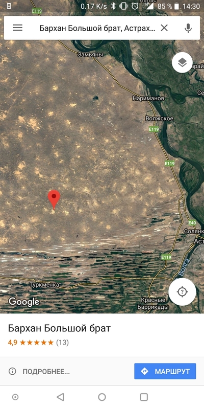 Поэтому бархан необычен даже для городских жителей. С учётом, что на нём легко застрять, и дорога до него не самая весёлая в плане требований к машине (нужен внедорожник и навыки), добрые люди взяли и переставили точку на Яндекс.Картах на барханчик поменьше прямо у трассы. Настоящий спрятался, но на всё равно найти его довольно легко.